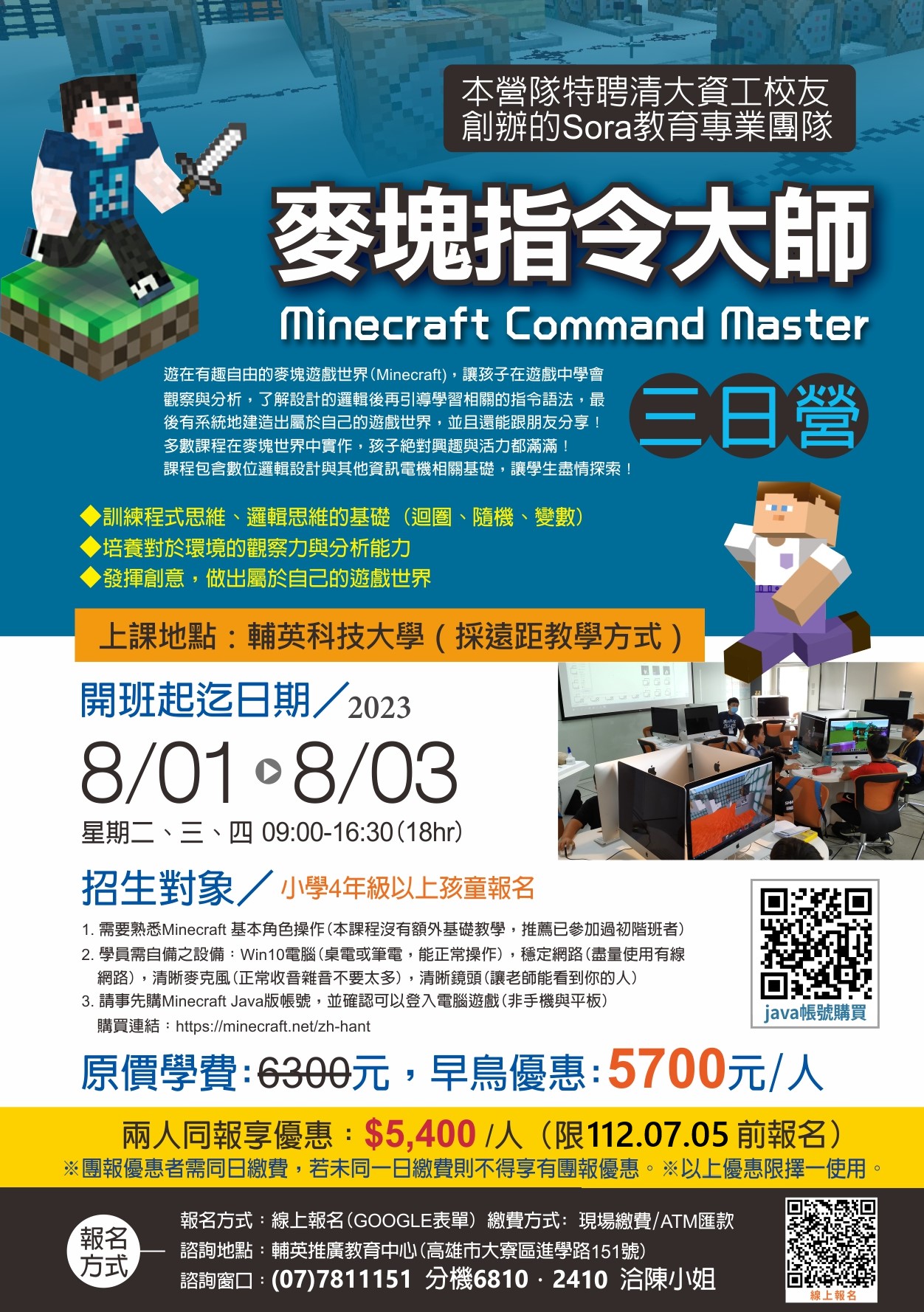 二、 小學4年級以上孩童報名,需要熟悉 Minecraft 基本角色操作(本課程沒有額外基礎教學,推薦已參加過初階班者)。