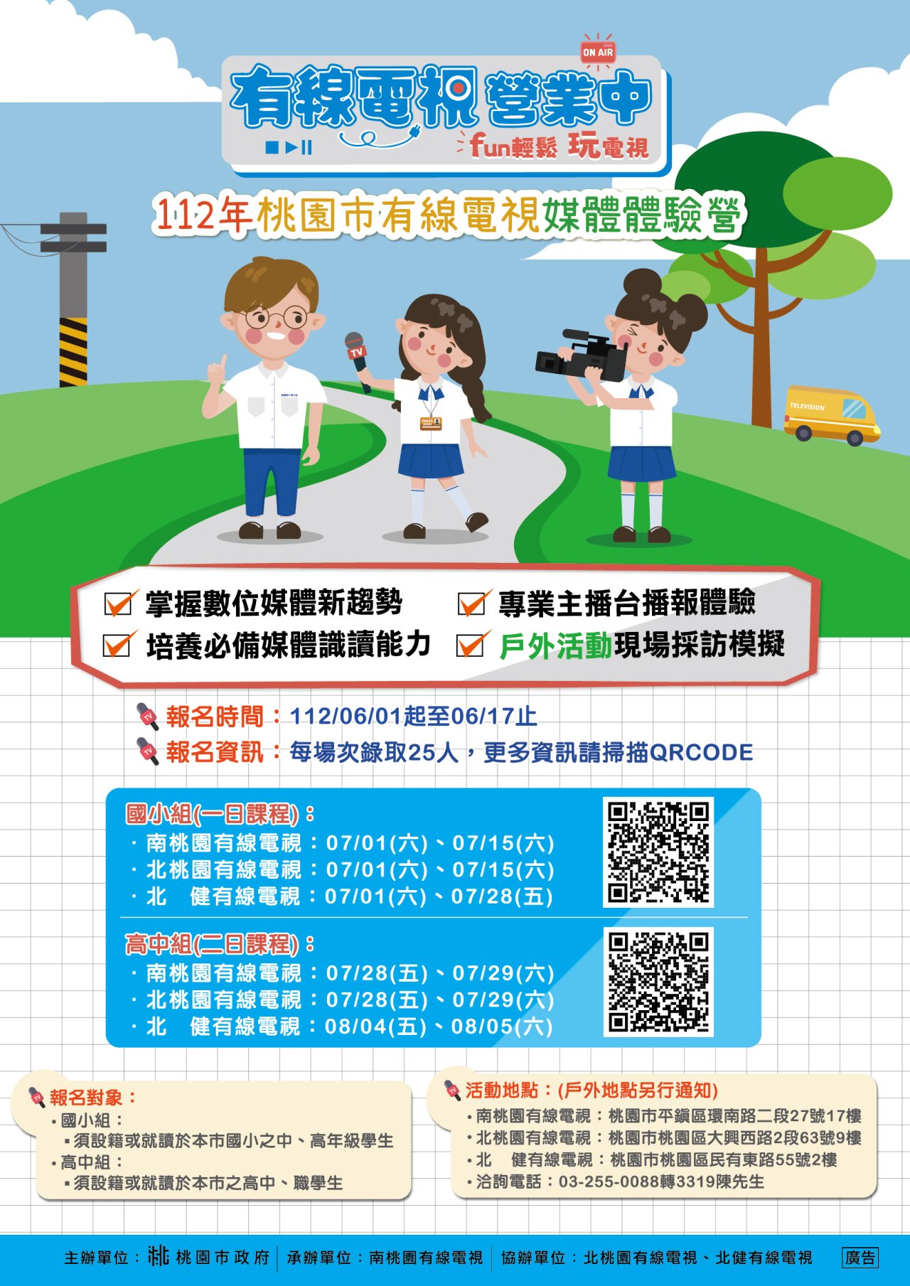 (一) 本活動於七月八月間舉行,開放桃園市就學(或設籍)的國小中高年級學生,以及桃園市就學(或設籍)的高中/職學生免費報名參加。 (二) 國小組共六場次,各一天,共150個名額。高中職組三場次,各兩天,共75個名額。 (三) 本活動報名受理時間為112年6月1日至6月17日止。 (四) 報名資格、營隊日期、地點和報名連結詳如附件宣傳海報圖檔,紙本宣傳海報將於5月22日寄達各校,請各校協助公告及鼓勵學生報名參加。