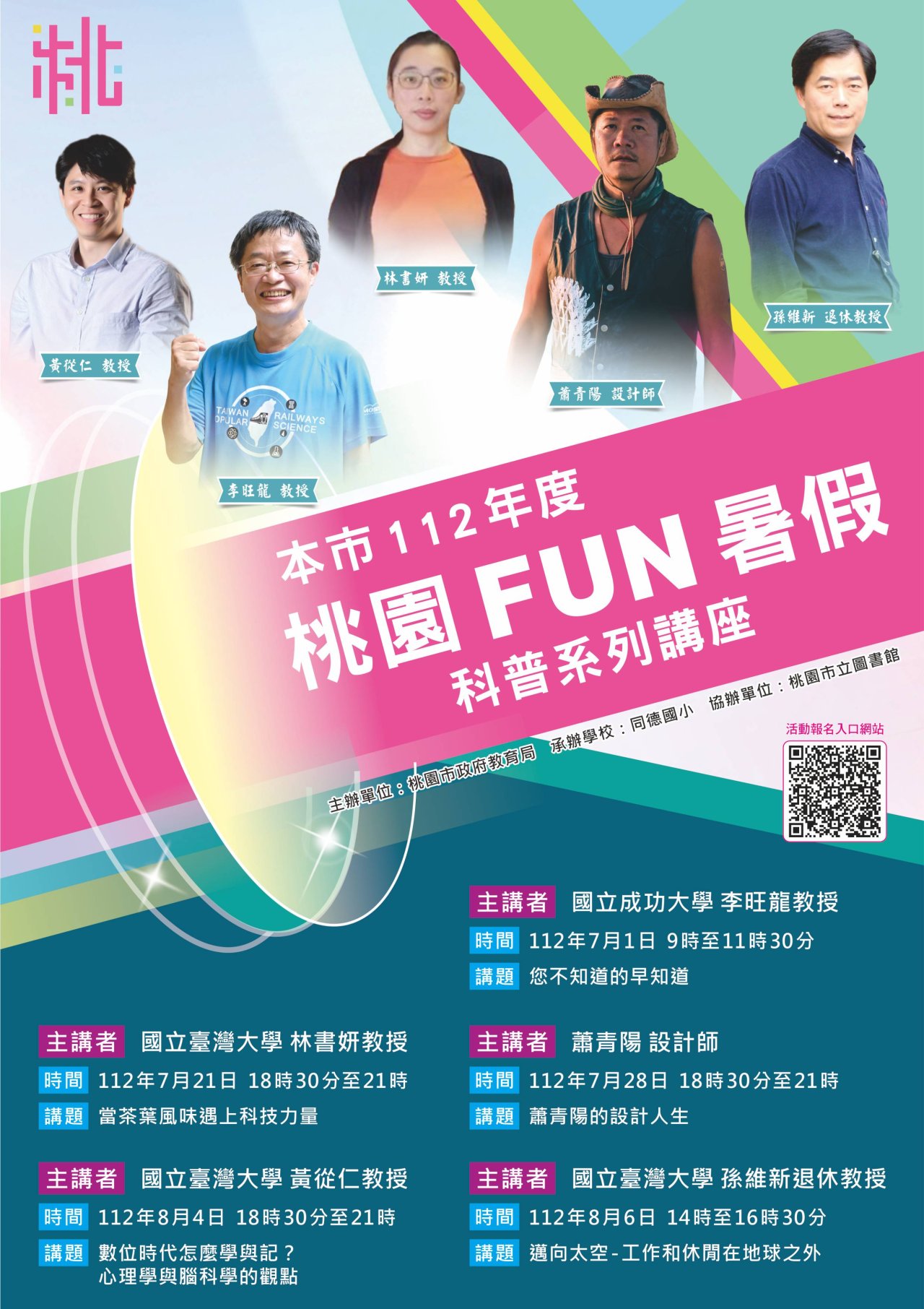 (二) 科普講座:邀請國立臺灣大學孫維新退休教授、國立成功大學李旺龍教授、甫獲得葛萊美獎蕭青陽設計師、國立臺灣大學黃從仁教授及林書妍教授分享科普知識,訂於本市立圖書館微光廳辦理5場次科普講座,參加對象為國中小學生及家長為主,每場預計200人次參加。