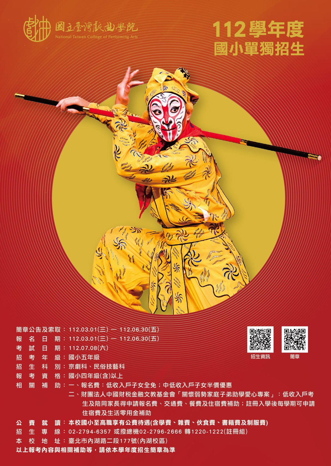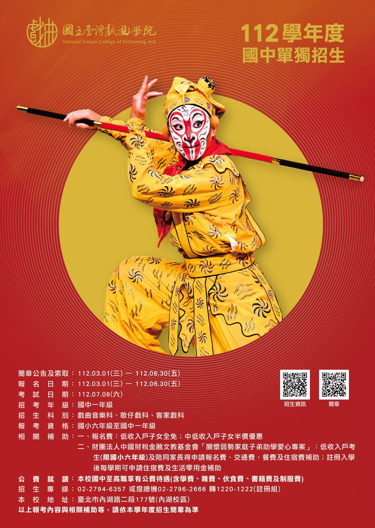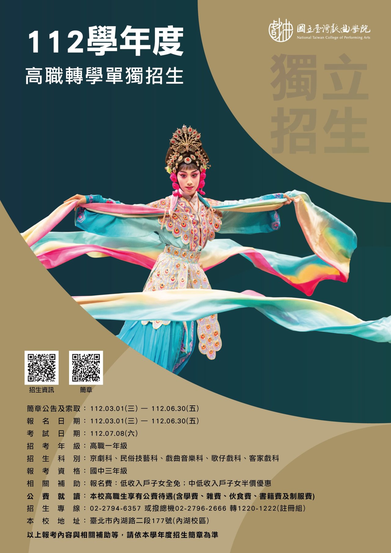 | 七、 | 檢附旨案招生相關文宣,其它多元招生資訊請關注「國立臺灣戲曲學院招生資訊」臉書粉絲專頁(https://www.facebook.com/NTCPA.Information),亦可參考該校宣傳影片《劇校生的一天》(https://youtu.be/_yd-OI_l4BU),招生專線:(02)2794-6357。 |