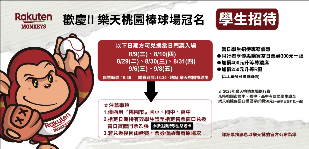 元,歡迎市民朋友踴躍進場看球,共挺桃猿;為利民眾充分知悉活動資訊,請各校協助公告周知,鼓勵學生進場觀賽。