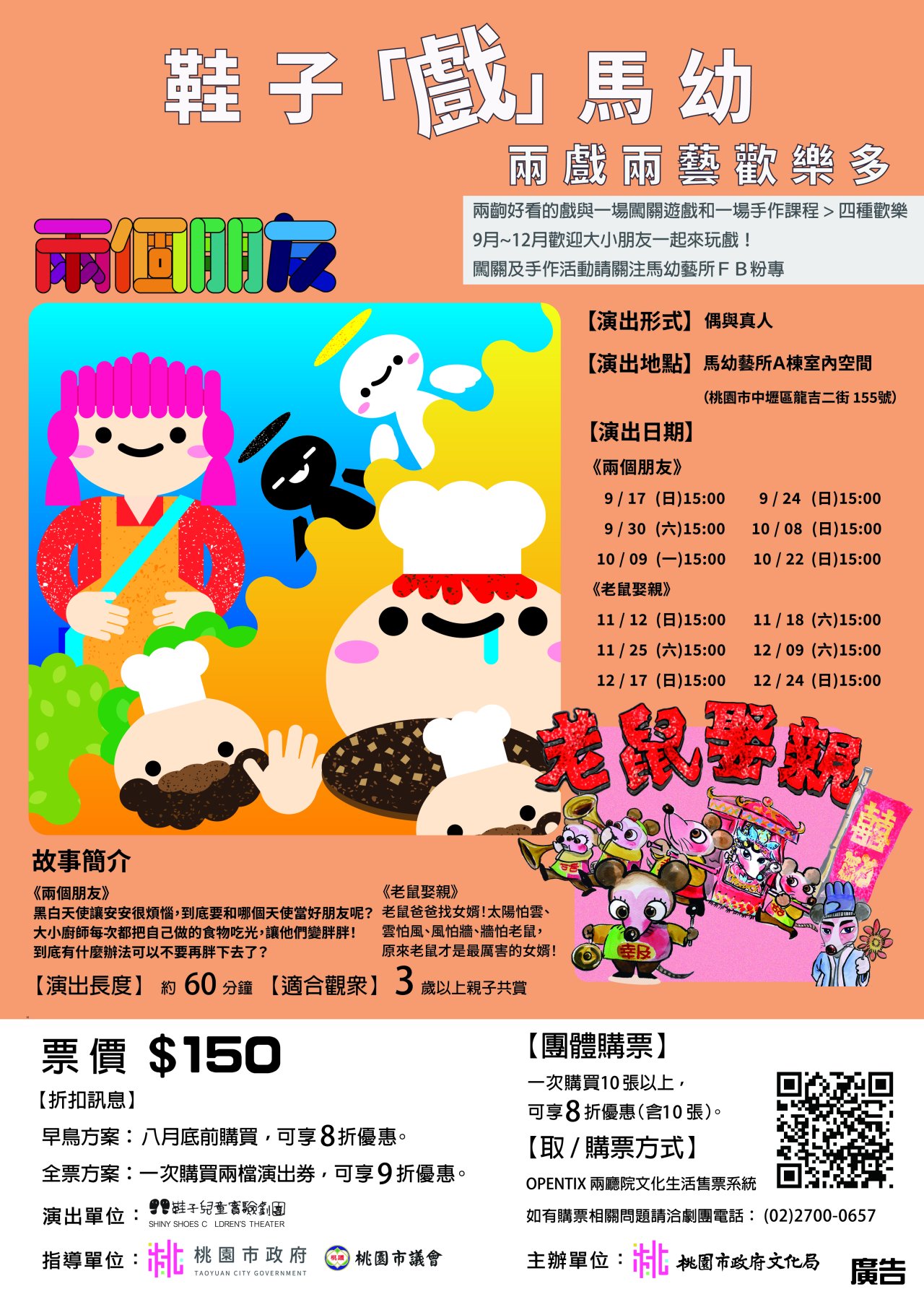 一、 本局為持續推動眷村文史保存與藝術人文教育自幼紮根,同時為推廣兒童及親子友善之藝文活動,特於本市馬祖新村眷村文創園區「馬幼藝所」(中壢區龍吉二街155號)規劃辦理藝術駐村計畫,本(112)年度9至12月由成長文教基金會附設鞋子兒童實驗劇團進駐,推出「鞋子戲馬幼」系列活動,為市民帶來豐富的表演藝術饗宴。