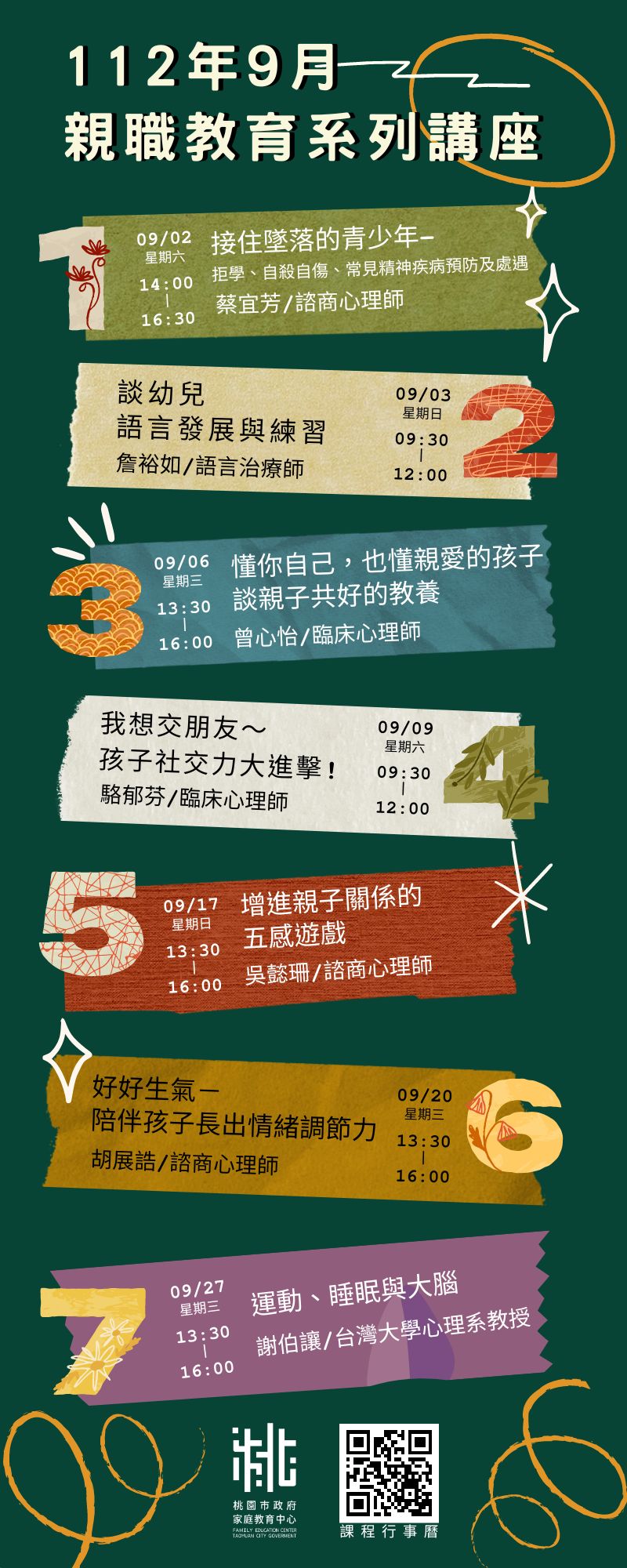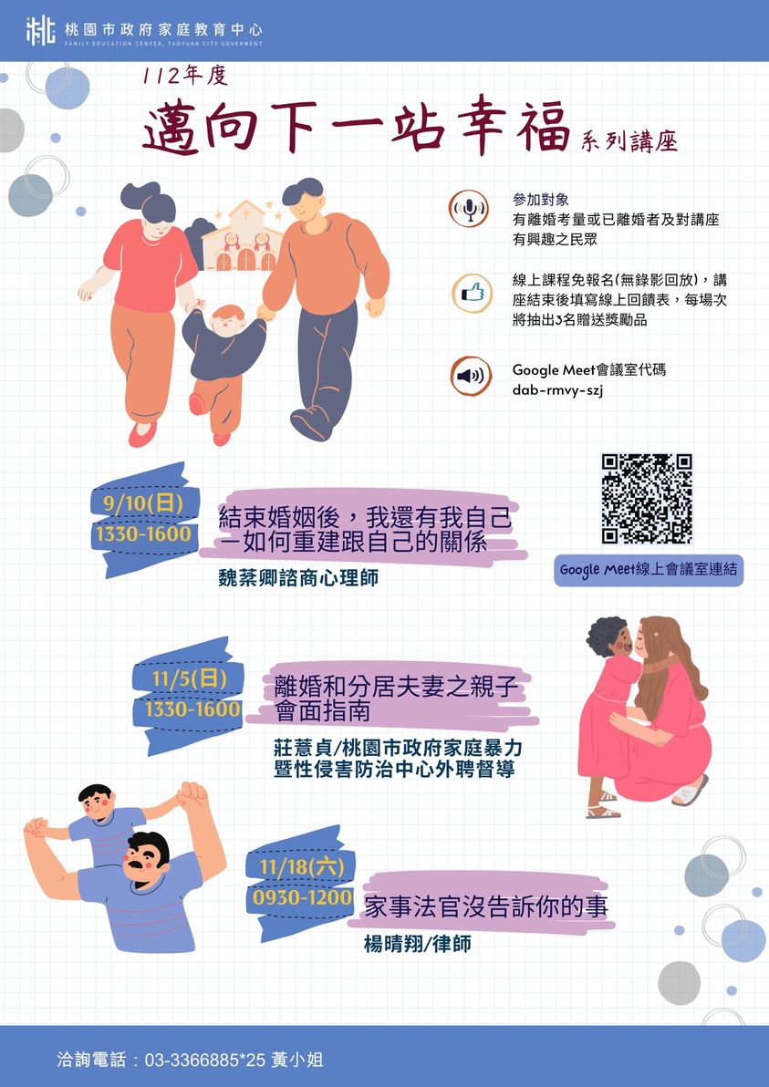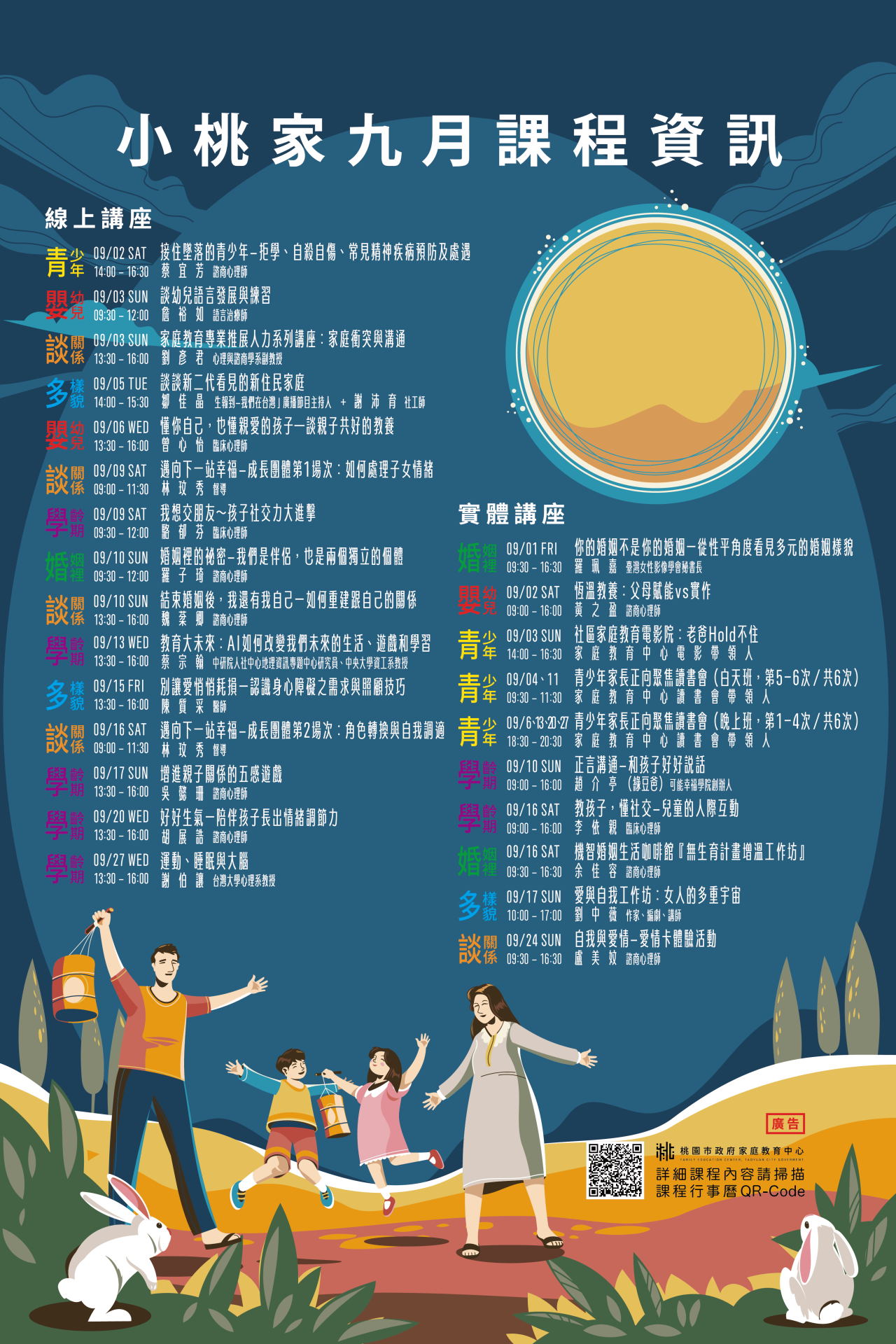 旨揭課程詳細資訊,請見課程行事曆( https://reurl.cc/xlGyGL );另倘有家庭教育個別化服務需求,可撥打4128185諮詢專線或申請小桃家線上諮詢室( https://reurl.cc/oZWOY5 )服務。