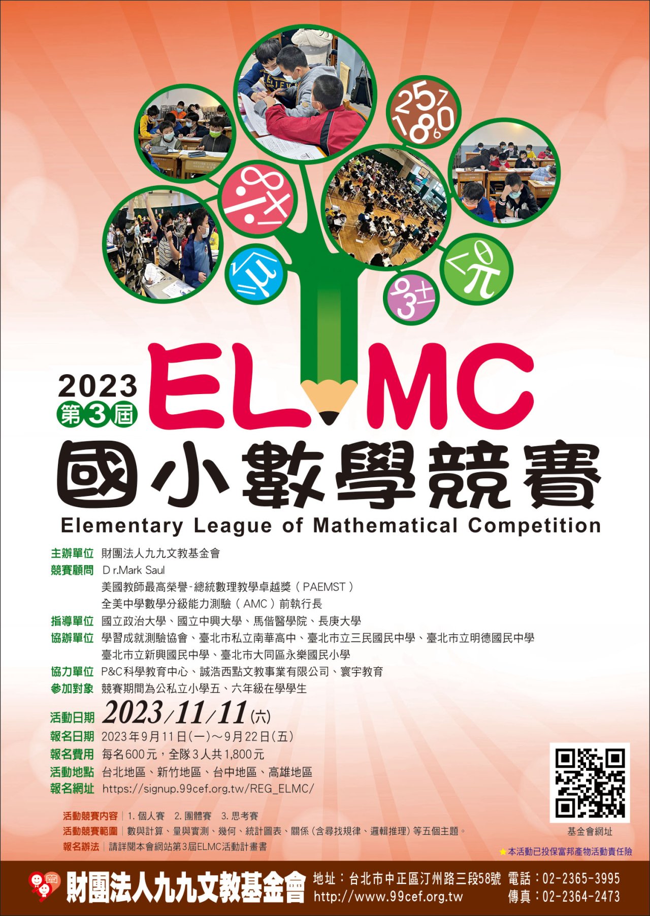 112年11月11日(星期六)舉辦第三屆ELMC國小數學競賽,敬請學生報名參加