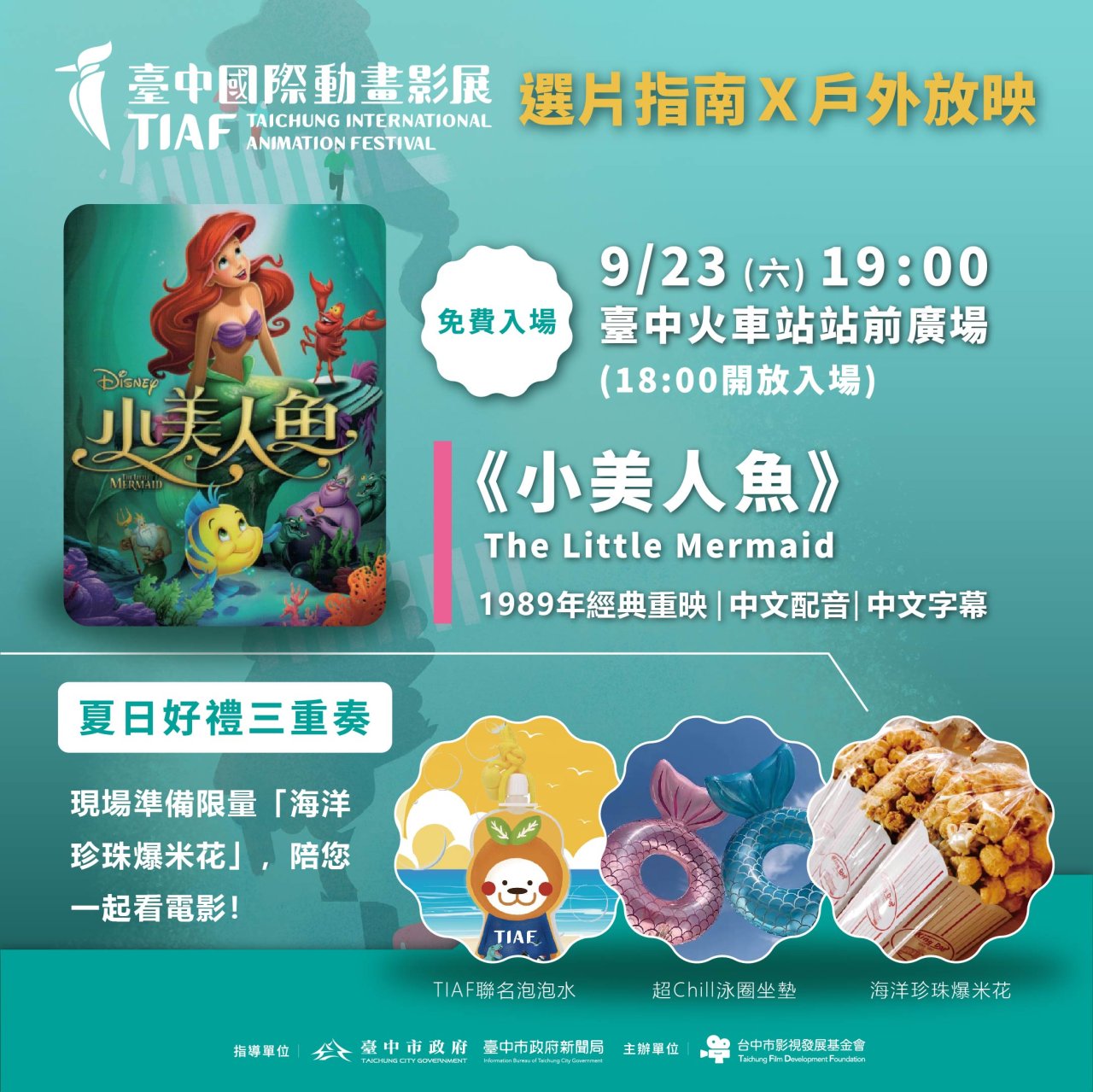 (一) 迪士尼知名動畫電影《小美人魚》1989年經典重映,112年9月23日晚上7點於臺中火車站站前廣場,免費入場欣賞。