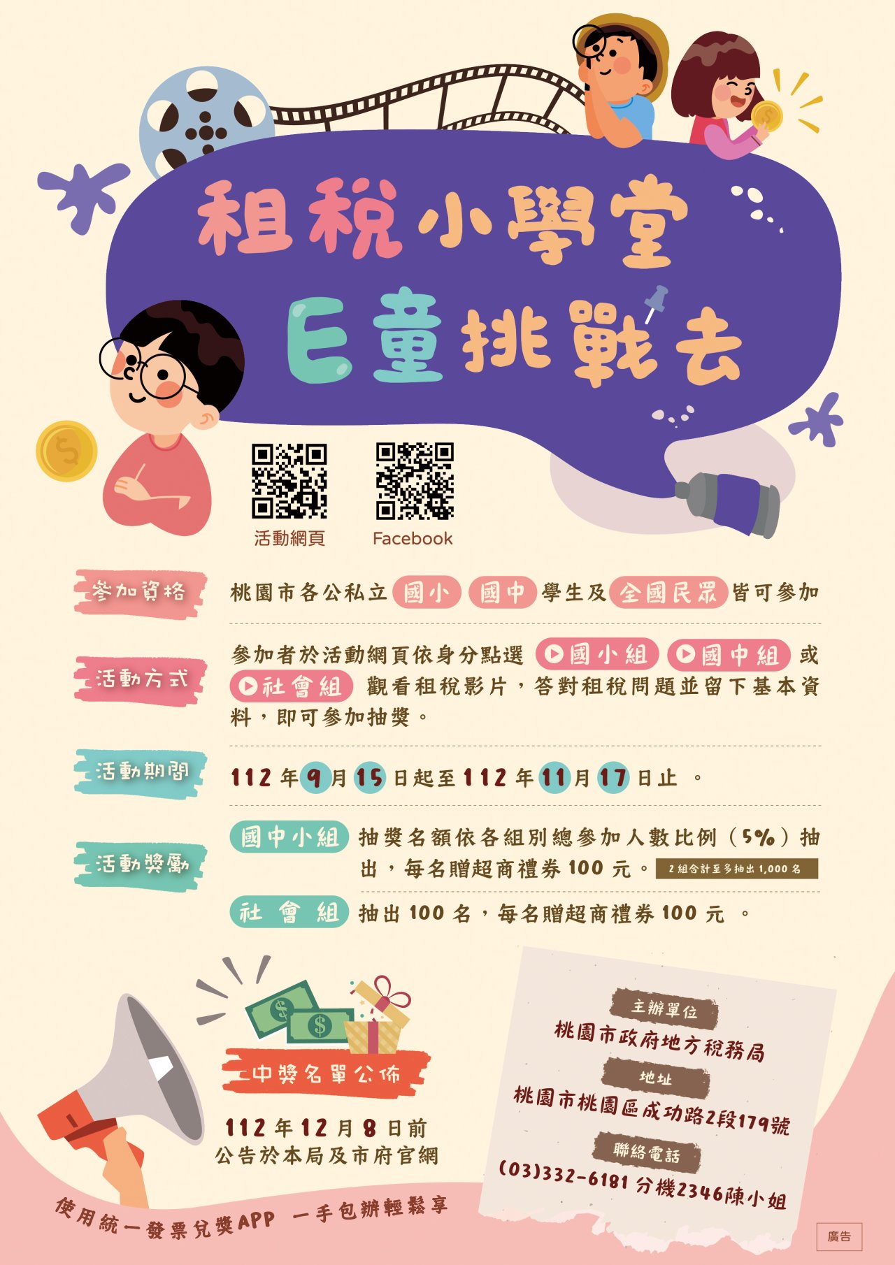 (三) 活動方式:參加者依據身分別點選「國小組」、「國中組」或「社會組」,於活動頁面觀看租稅影片後,正確回答租稅問題並留下基本資料者,即可參加抽獎。