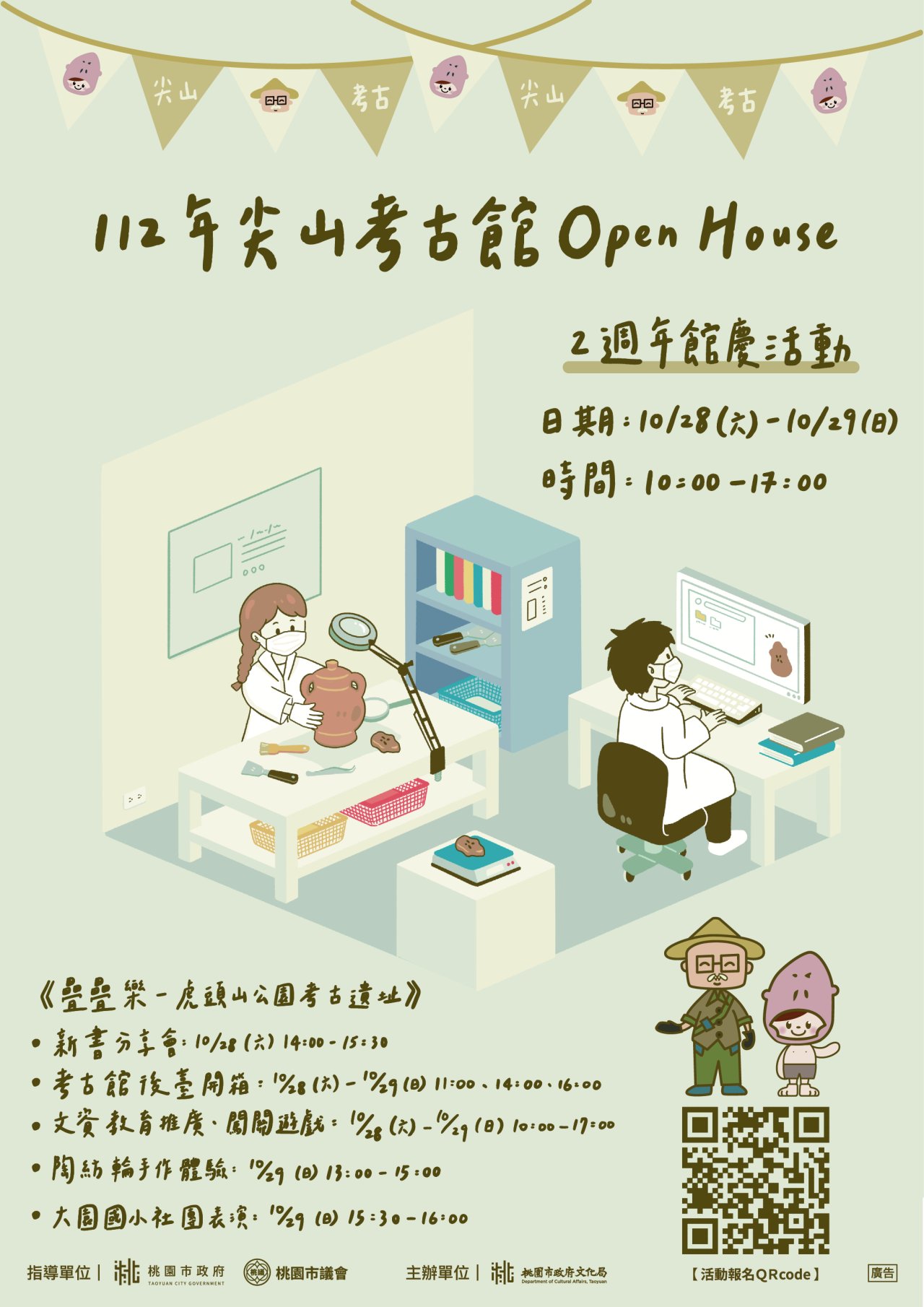 (二) 考古館後臺開箱活動:112年10月28日及10月29日,每日3場次(上午11時至12時、下午2時至3時、下午4時至5時),在書藝館D棟B1大園尖山考古展示館舉辦。