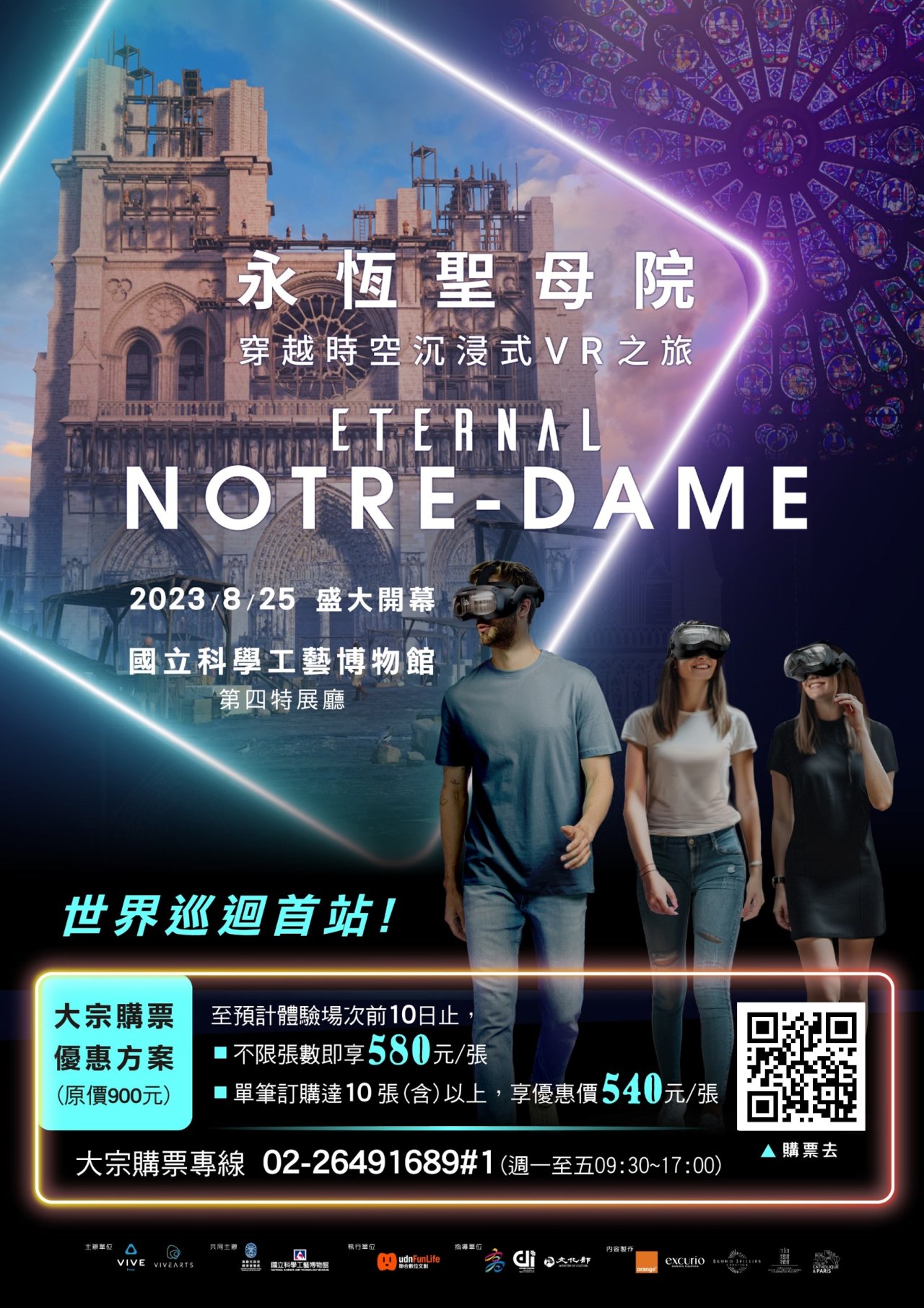 一、 法國指標性的哥德式建築,同時也是寶貴的文化藝術資產「巴黎聖母院」於2019年4月慘遭祝融,重建計畫受到全球矚目及支持,除了建築本身的修建外,法國電信商Orange與天主教巴黎總教區、巴黎市政府合作打造以融合VR科技的沉浸式體驗《永恆聖母院》來重現巴黎聖母院的歷史與藝術價值,也被視為科技復興世界文化遺產的重要里程碑。如此別具歷史意義的VR體驗在HTC、VIVE Arts策畫、本公司執行的共同合作下,引進台灣作為海外巡迴首站。《永恆聖母院》是一趟穿越時空的沉浸式數位旅行,觀眾來到《永恆聖母院》的展覽現場,建立一個虛擬分身之後,僅須配戴VR頭顯裝置及背包,就可以在虛擬導遊的引領下,飛越國界直達法國,重回十二世紀巴黎聖母院開始建造的最初時刻。深入建築內部,以360度全方位近距離觀賞末日審判之門、祭壇、拱頂、玫瑰花窗、管風琴等精湛絕美的建築元素;最後跟著升降梯登上69公尺高的鐘塔,在巨鐘的底下感受多具銅鐘齊響的震撼。還能走出塔樓到戶外,以絕佳的視野俯瞰瞭望大文豪雨果筆下的巴黎世界,並重回2019年燒毀前屋頂尖塔的火災現場,向世人展示正如火如荼進行中的修復計畫。全長共45分鐘的VR走動式體驗,《永恆聖母院》將提供學生們一個既有趣又教育性的嶄新體驗,有助於拓寬國際藝文視野及對於元宇宙、虛擬實境科技的認識。