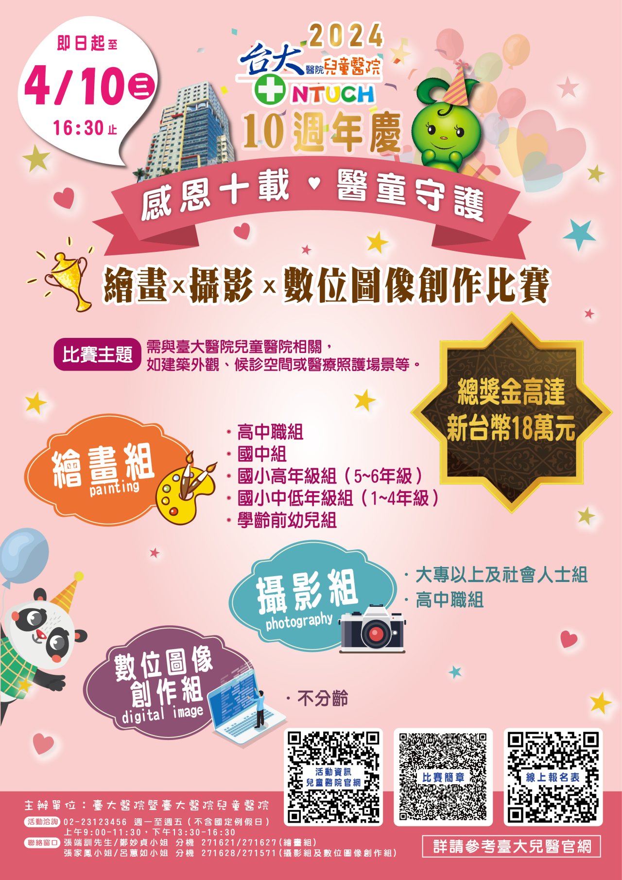 二、 為慶祝該院兒童醫院成立10週年,讓社會大眾看到不一樣的兒童醫療,該院特別舉辦繪畫、攝影及數位圖像創作比賽,詳情請洽該院兒童醫院官方網站活動公告區(https://www.ntuh.gov.tw/ntuch/Index.action),活動海報、比賽簡章(詳如附件)。