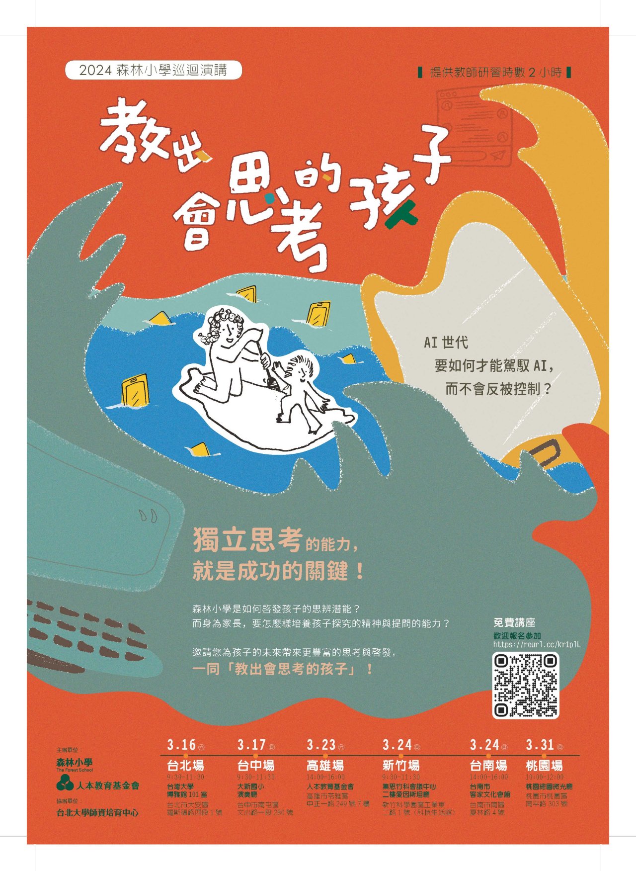 | 二、 | 講座內容包含森林小學教學理念及教學方法,如何啟發孩子思考、激發動力、傳遞方法;如何藉由「玩的學習」培育孩子「成為他自己」,散發主動、與人及知識共鳴的特質。 |