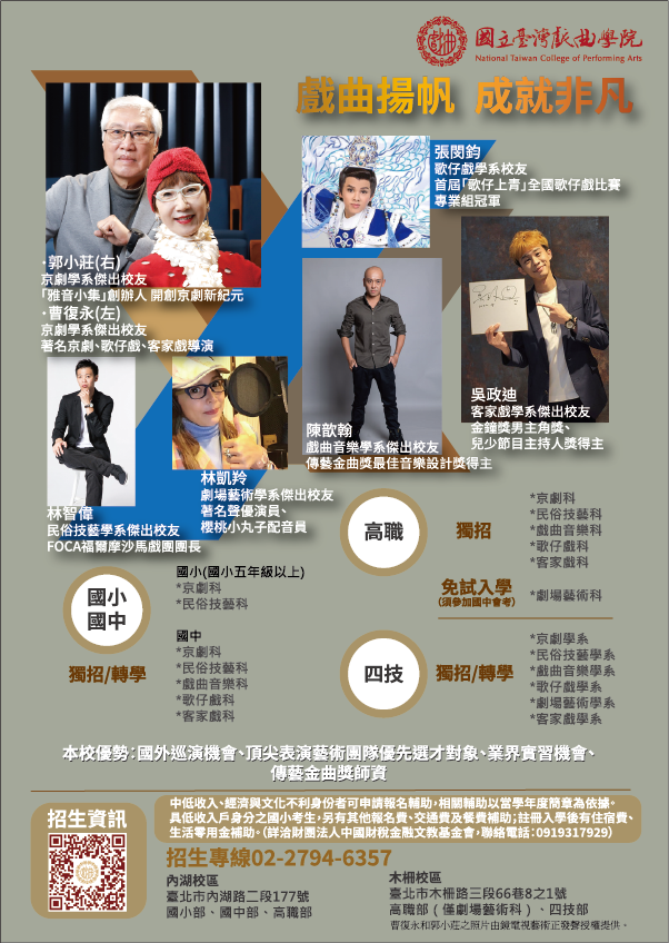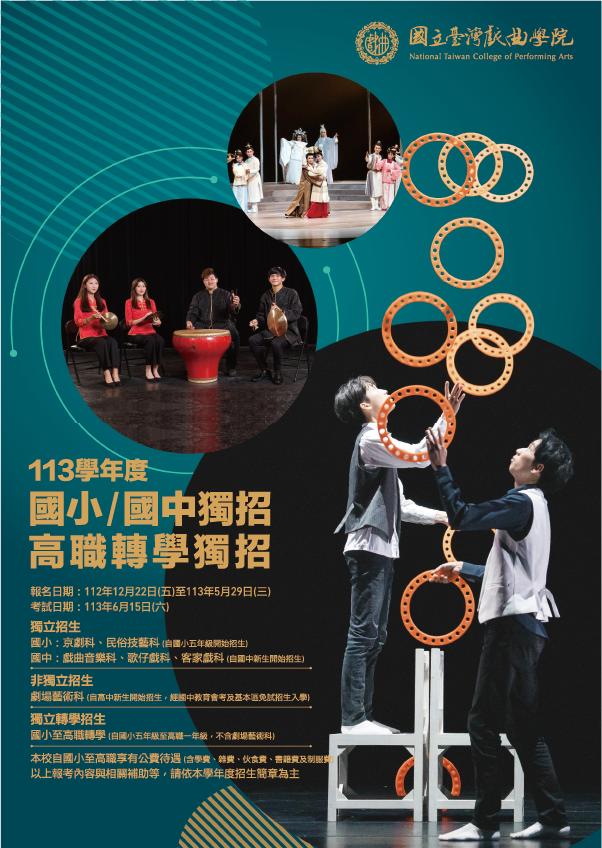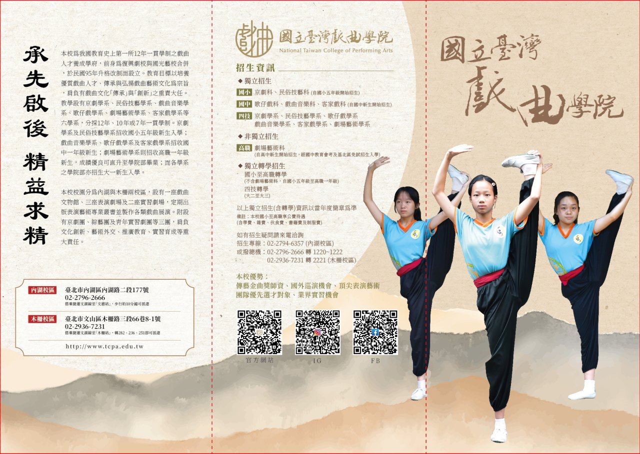 | 十、 | 其它多元招生訊息請關注「國立臺灣戲曲學院招生資訊」臉書粉絲專頁(https://www.facebook.com/NTCPA.Information),亦可參考嘎校宣傳影片《劇校生的一天》(https://youtu.be/MbvBRcYr_u8?si=_v-OXf0POchqaPXn)。 |