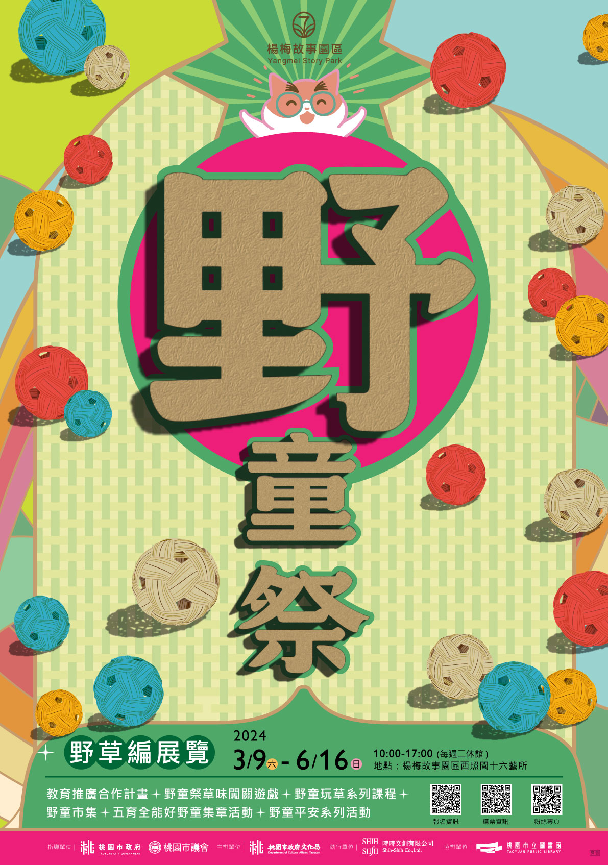 說明: 一、 旨揭展覽訂於113年3月9日(星期六)至6月16日(星期日),上午10時至下午5時(每週二休館),於楊梅故事園區西照閭十六藝所展出。 二、 另,自4月4日(星期四)至4月7日(星期日)辦理「野童玩草系列課程」、「野童市集」、「闖關遊戲」及「五育全能好野童集章」等系列活動,歡迎各單位踴躍報名參加。 三、 相關資訊請至楊梅故事園區社群粉絲專頁查詢,網址:https://www.facebook.com/YangmeiStoryPark/。