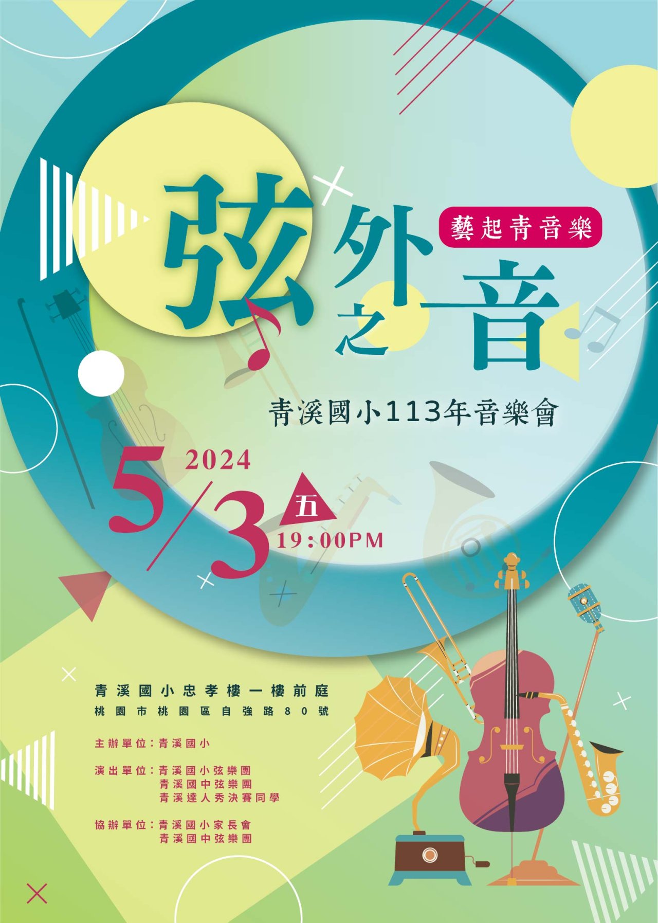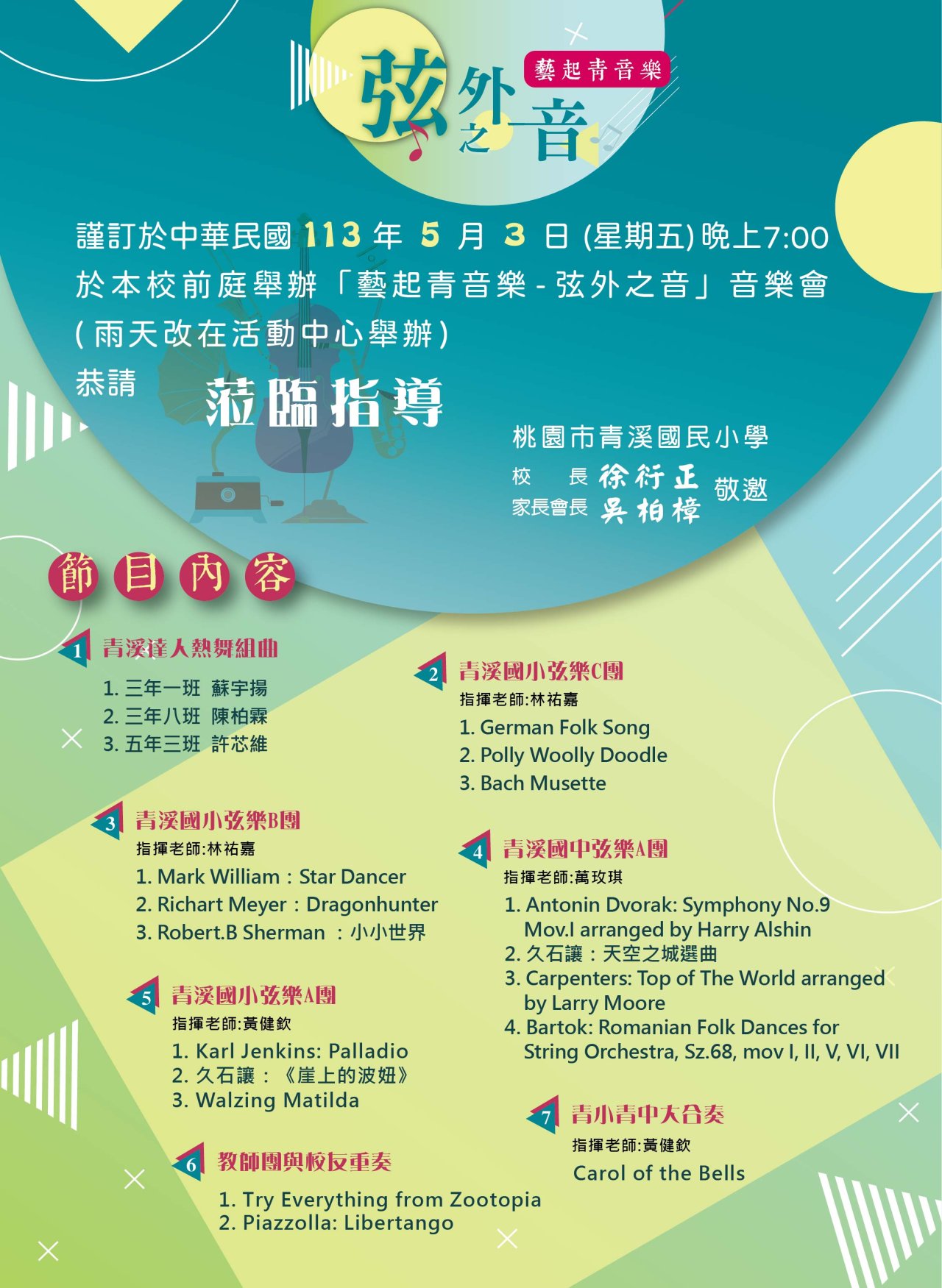 說明: 一、 本校弦樂團每年皆定期舉行公開演出,讓弦樂帶給校內學子及周邊社區更豐富美妙的文化盛宴,並啟發更多不同聽眾對音樂的探索與喜愛。 二、 旨揭音樂會相關訊息如下: (一) 演出時間:113年05月03日(星期五)晚上7:00。 (二) 演出地點:本校忠孝樓一樓前庭 (桃園市桃園區自強路80號)。 三、 檢附旨揭音樂會海報及節目內容供參
