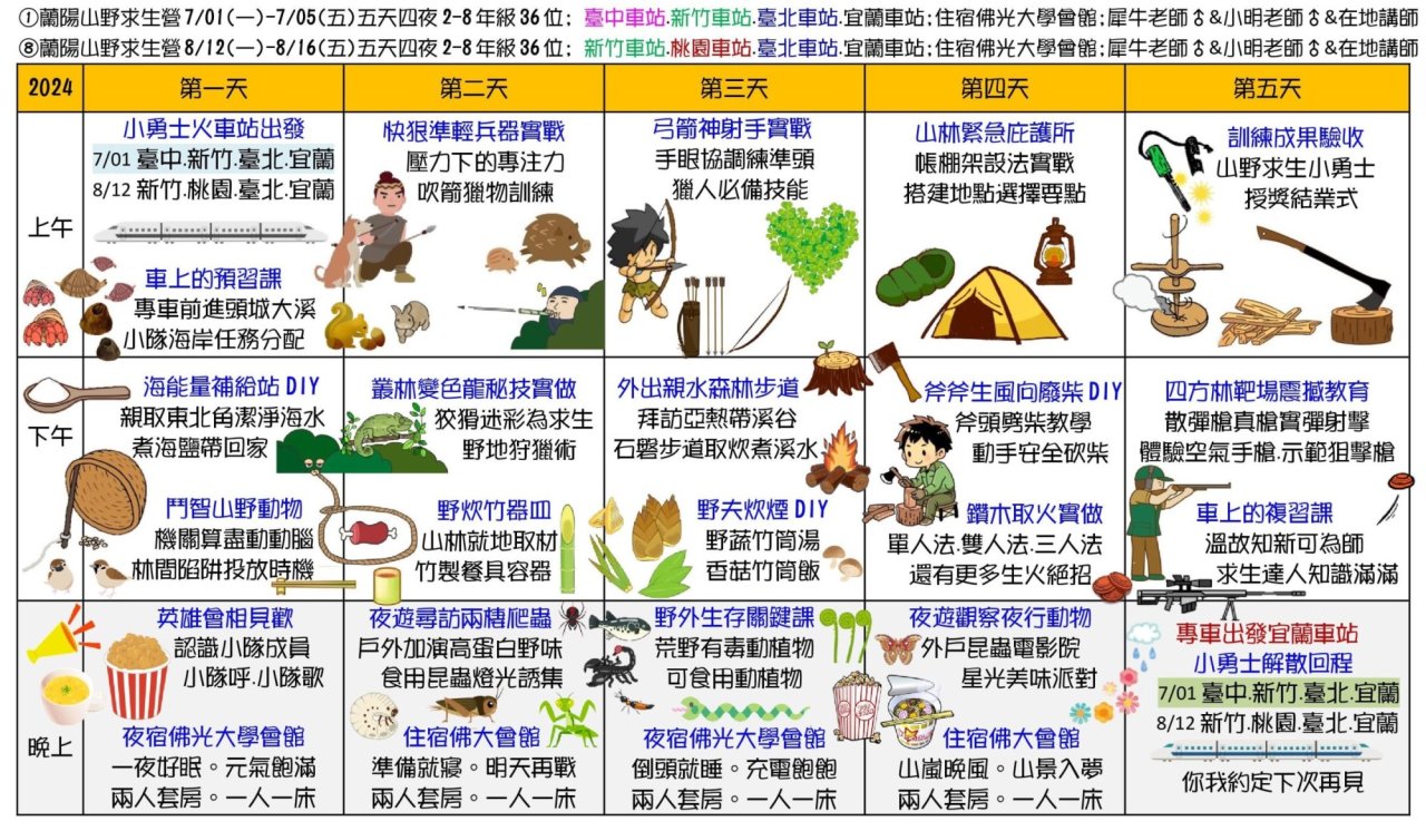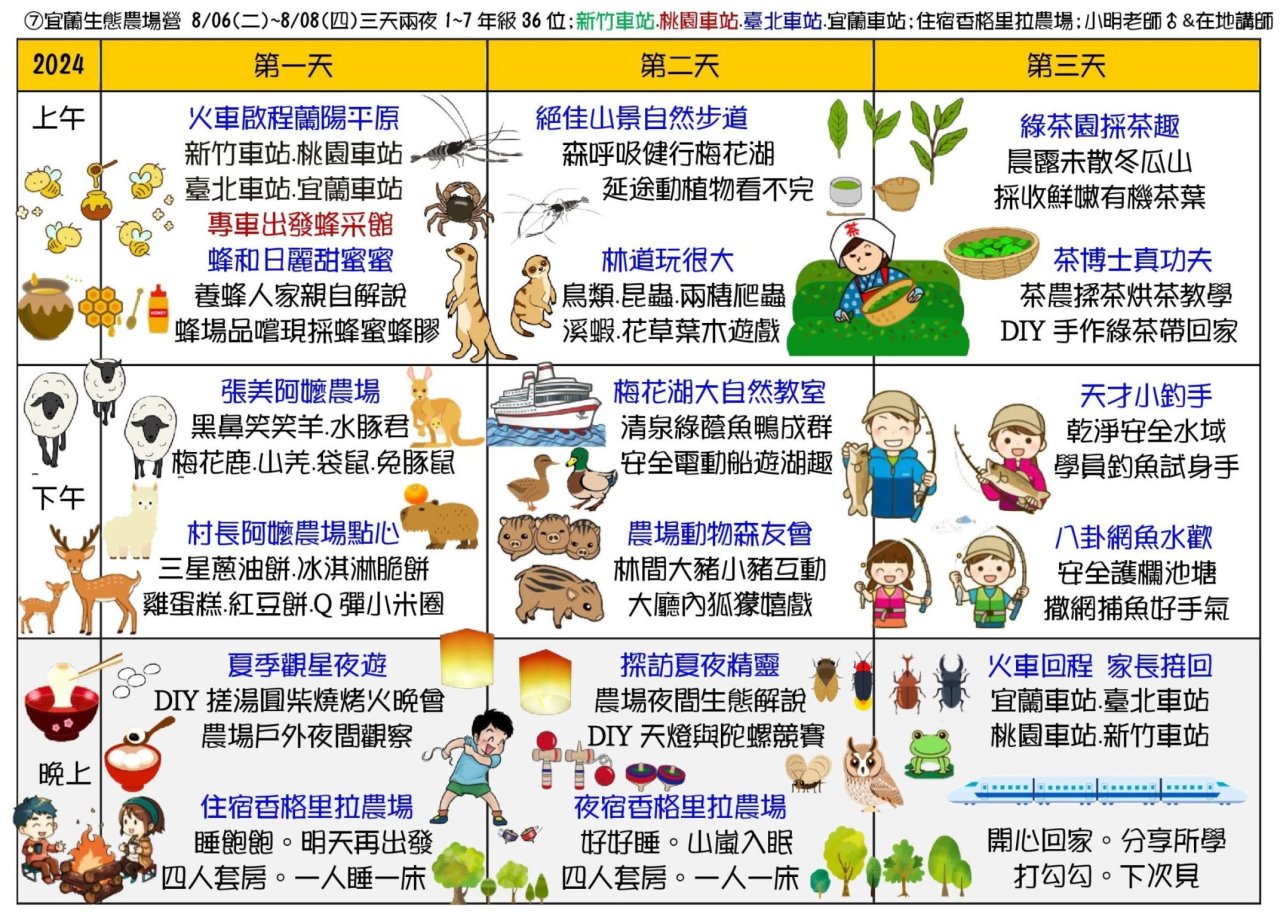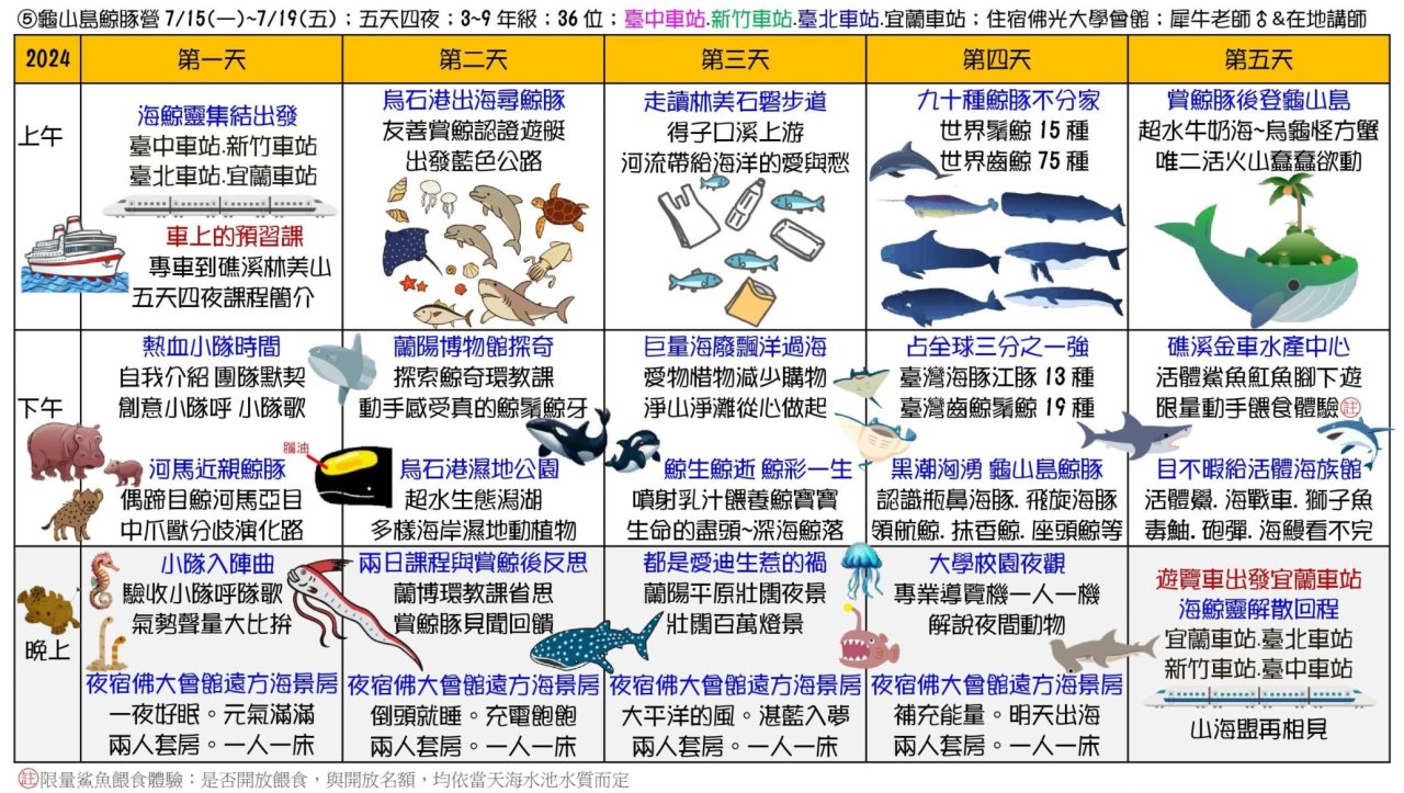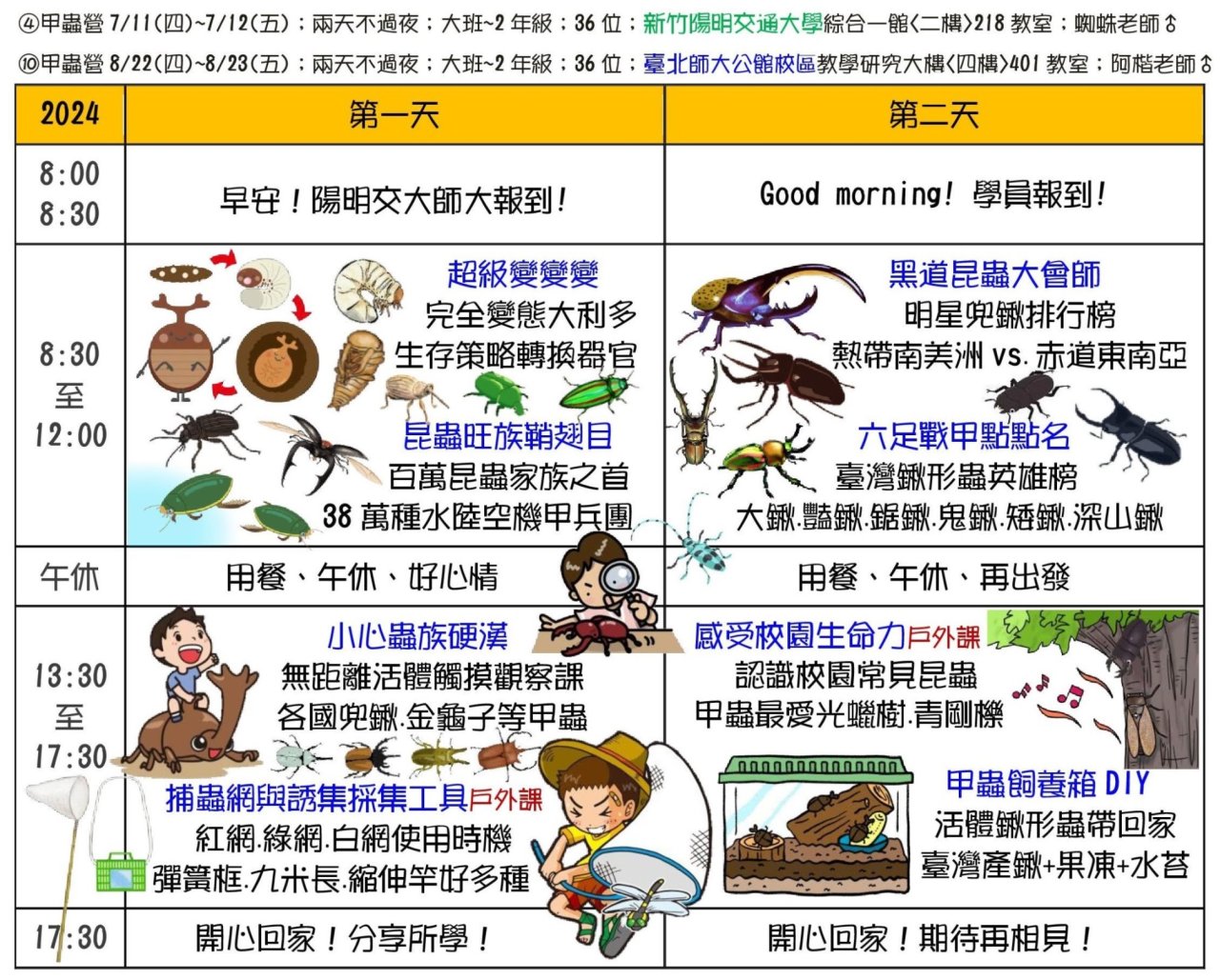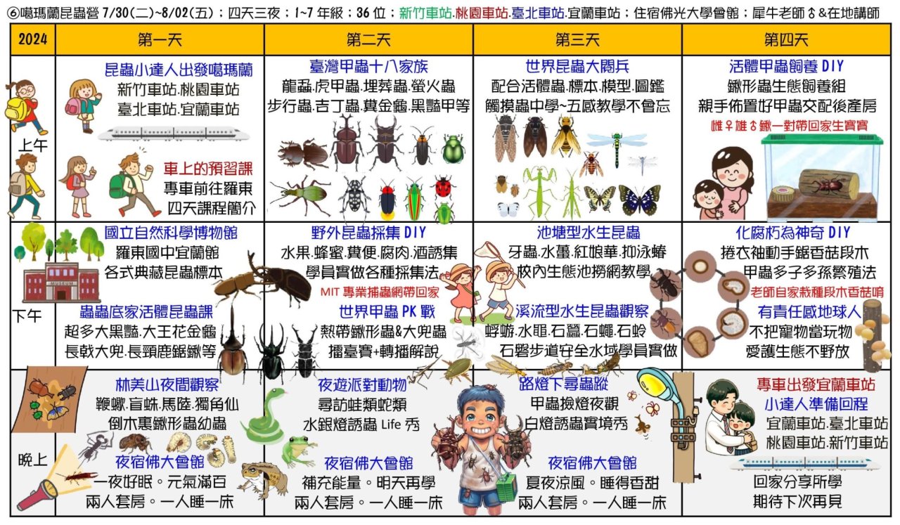 三、    課程主題:蘭陽山野求生營、南臺灣諾亞方舟營、龜山島鯨豚營、噶瑪蘭昆蟲營、宜蘭生態農場營、動力科學營、甲蟲營、綠世界六足昆蟲營。