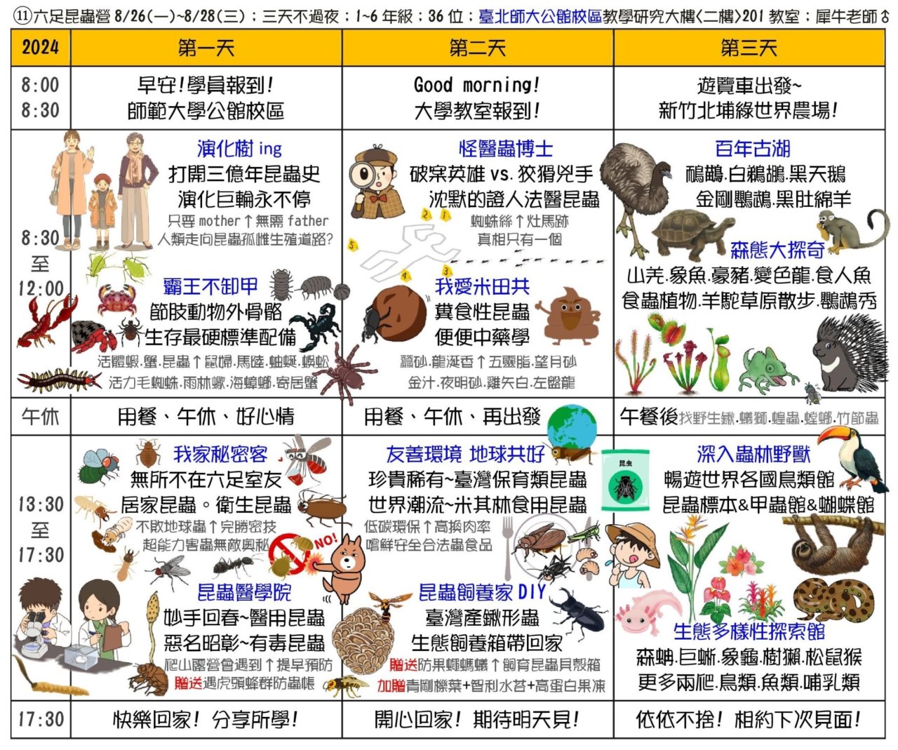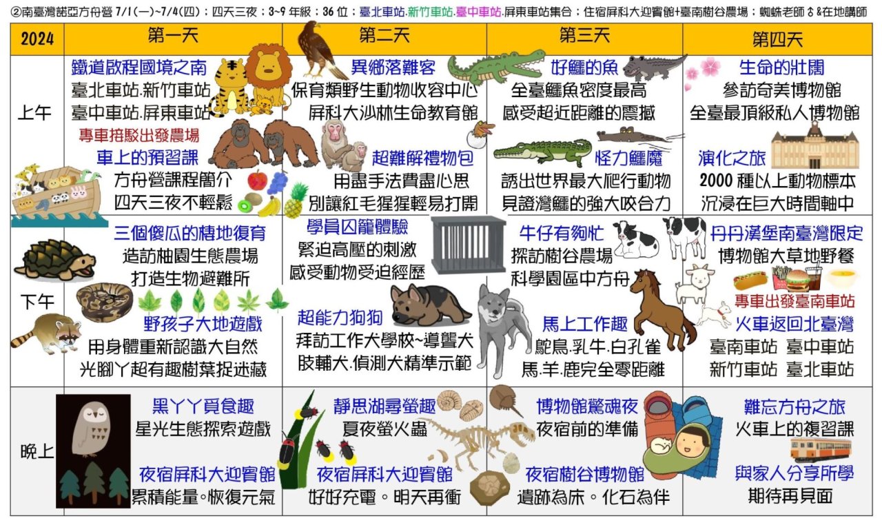 說明:    愛上大自然文教將於113年7月1日~8月28日舉辦【大樹聚島航去】2024生態素養夏令營共八種生態主題營隊課程。