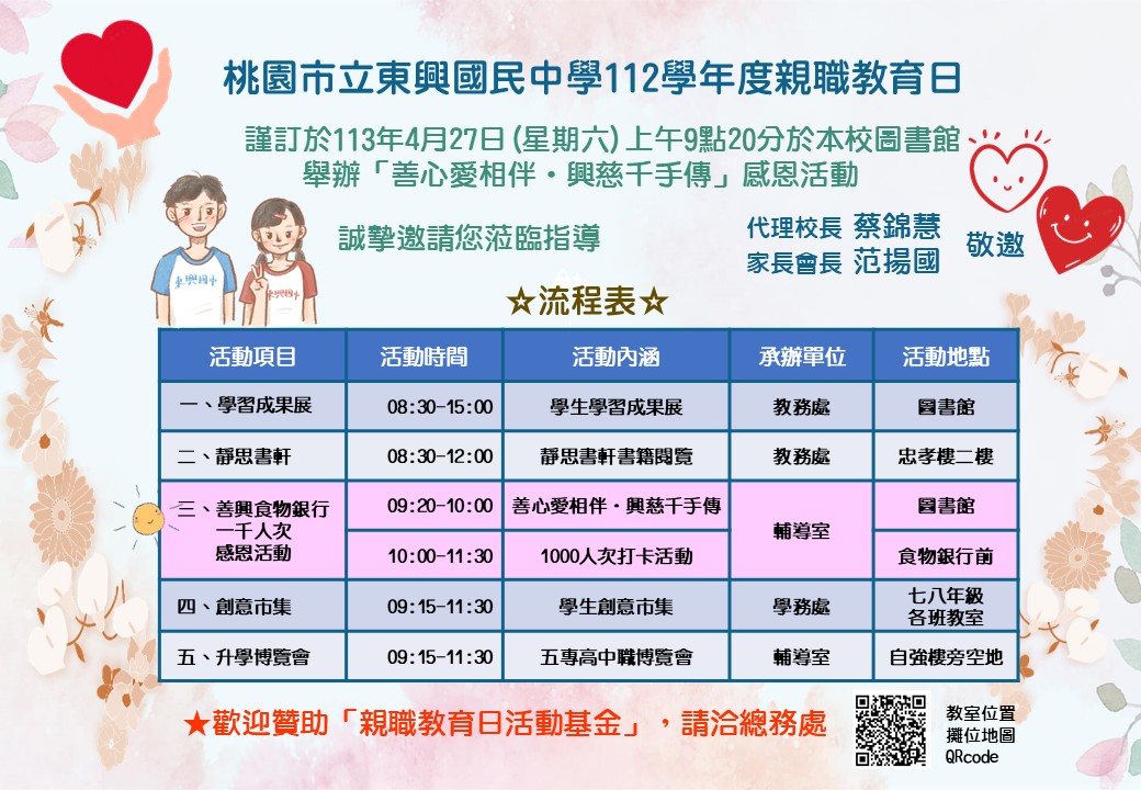 訂於113年4月27日(星期六)親職教育日上午9時20分,於圖書館舉辦「善心愛相伴、興慈牽手傳」感恩活動,敬邀各位教育先進蒞校指導。