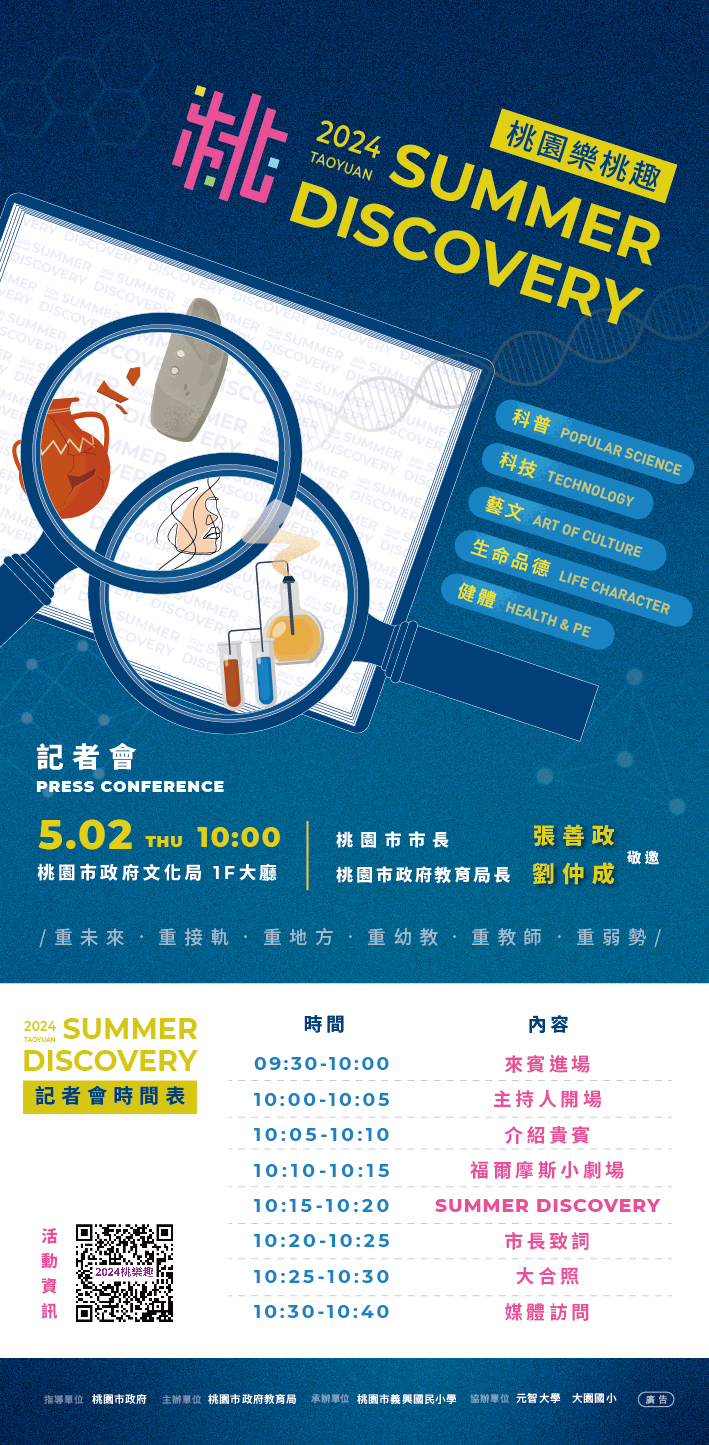 說明: 一、 為充實本市學生暑假生活,本局於113年暑期開辦「科技、科普、生命品德、藝文、健體」等5大主軸營隊活動,培養孩子兼具科普知識與人文素養。 二、 本活動記者會訂於113年5月2日(星期四)上午10時假桃園市政府文化局1樓大廳辦理,請貴校協助公告活動訊息。
