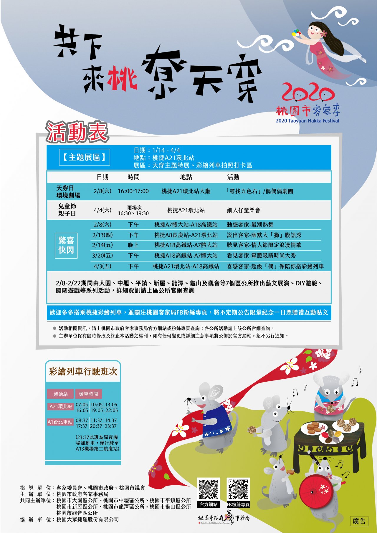 為增進民眾對客家天穿日之認識,規劃於109年2月至4月4日期間與桃園捷運合作推出「2020桃園市客家季」活動,期達到推廣客家文化傳承之目的,活動介紹網址如下:https://reurl.cc/5gmxqq