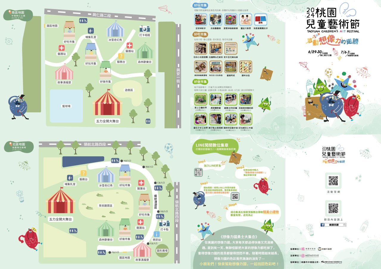 說明: 一、 本局為推廣兒童藝術啟蒙與在地藝文紮根,規劃辦理「2024桃園兒童藝術節」活動,活動內容包含兒童市集、小型表演、故事劇場、主舞台大型演出,辦理時間及地點如下: (一) 南區主題活動:6月29日(星期六)至30日(星期日)下午4時至晚間8時假中壢區興仁親子公園辦理。 (二) 北區主題活動:7月6日(星期六)至7日(星期日)下午4時至晚間8時假大園區桃園陽光劇場辦理。