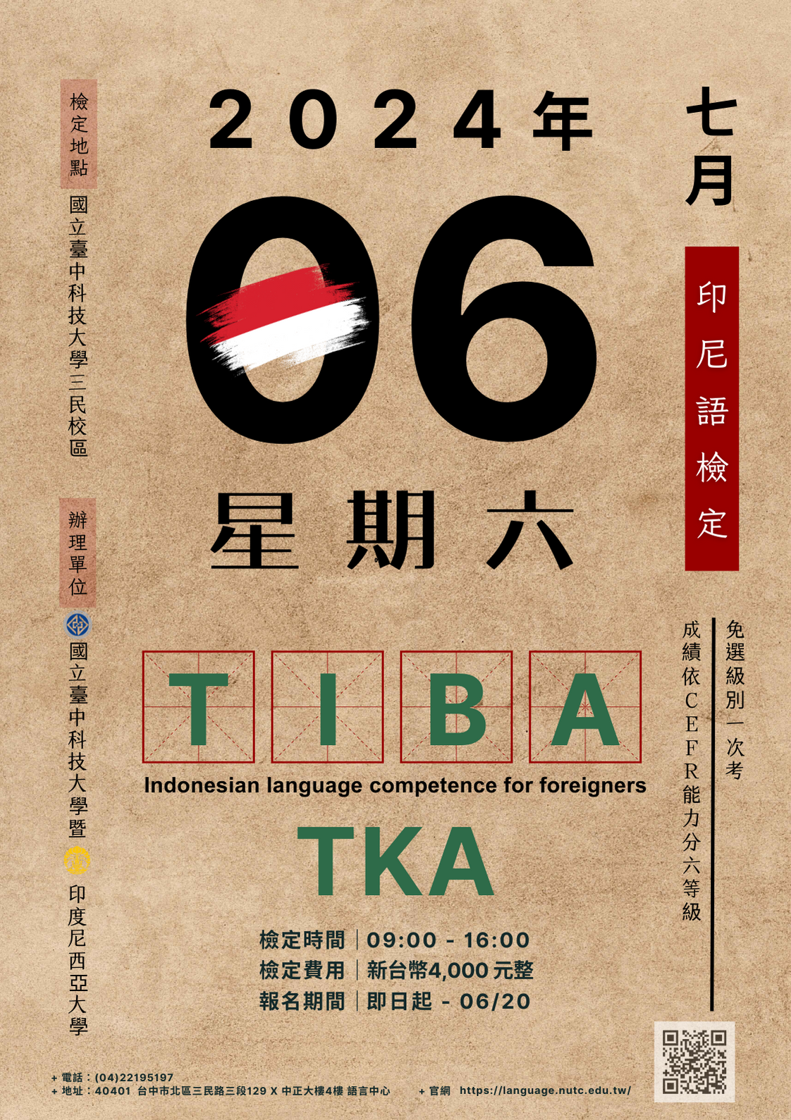 | 四、 | 檢定日期訂於2024年7月6日(星期六),考場設於國立臺中科技大學。 |
