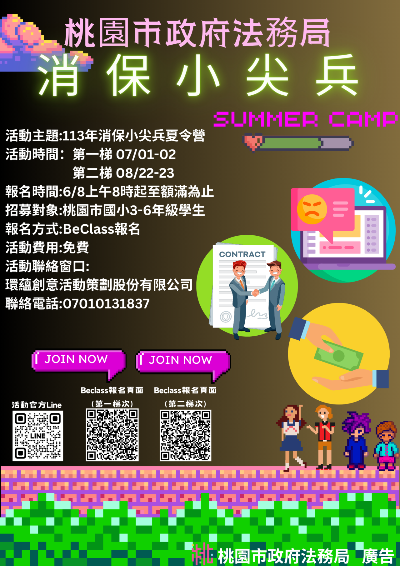 六、 本活動免費報名參加,無須繳交任何費用,因名額有限,如有意願者,請從速報名,以免向隅。檢附113年消保小尖兵夏令營DM及活動課程表1份。