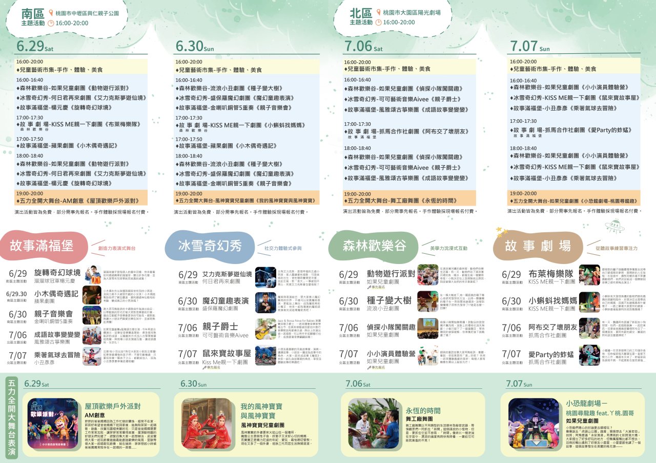 說明: 一、 本局為推廣兒童藝術啟蒙與在地藝文紮根,規劃辦理「2024桃園兒童藝術節」活動,活動內容包含兒童市集、小型表演、故事劇場、主舞台大型演出,辦理時間及地點如下: (一) 南區主題活動:6月29日(星期六)至30日(星期日)下午4時至晚間8時假中壢區興仁親子公園辦理。 (二) 北區主題活動:7月6日(星期六)至7日(星期日)下午4時至晚間8時假大園區桃園陽光劇場辦理。