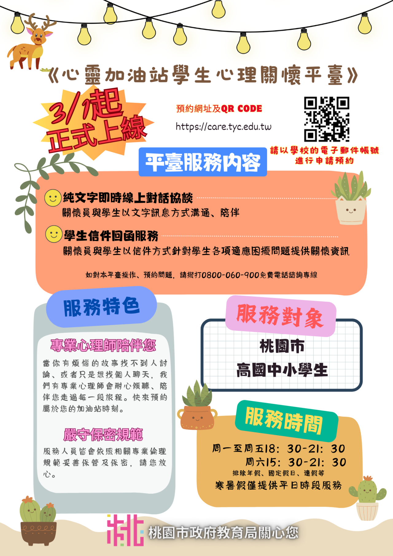 為提供學生於放學後時段,如有人際相處、課業、生涯規劃 等遭遇問題待關懷諮詢,倘學生有心理健康議題,本局建置 「心靈加油站學生心理關懷平臺