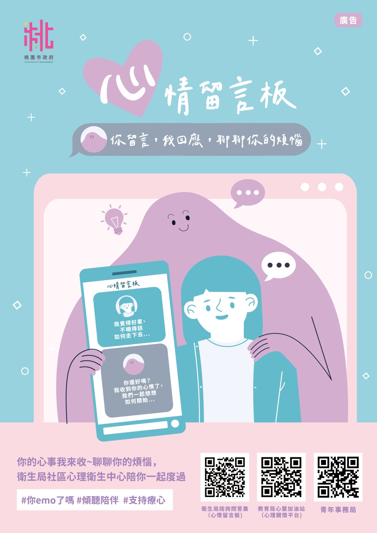 為推廣本市心理健康資源使用,社區心理衛生中心網站提供心情留言板服務,倘民眾於網站上留言,心衛中心專業人員於2日工作天內針對留言問題提供個別化回復,此服務具有匿名性、即時性、可近性、便利性等優點,可提供本市民眾除電話協談及面談諮詢外,更多元的心理資源選擇使用。