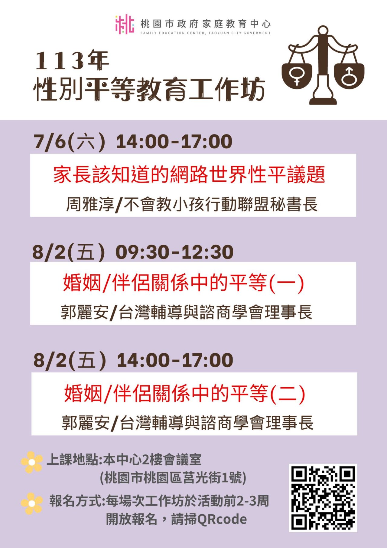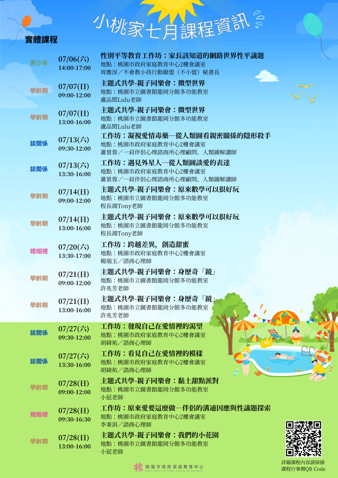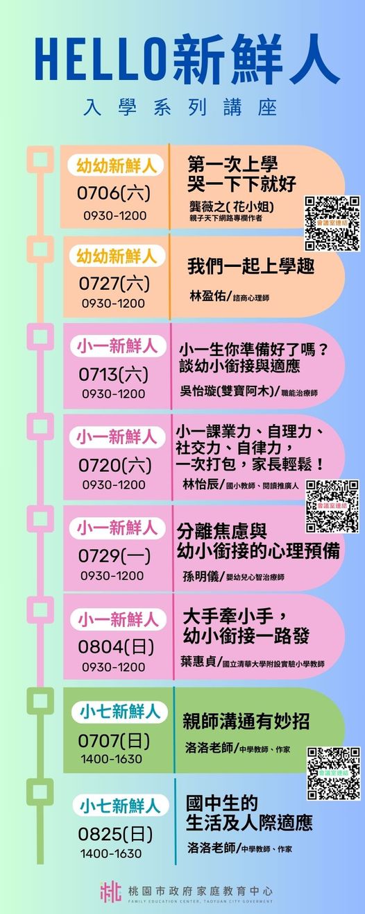課程詳細資訊,請見中心課程行事曆( https://reurl.cc/xlGyGL )或追蹤「桃園市政府家庭教育中心」FB粉絲專頁;另倘有家庭教育個別化服務需求,可撥打4128185諮詢專線或申請小桃家線上諮詢室( https://reurl.cc/oZWOY5 )服務。