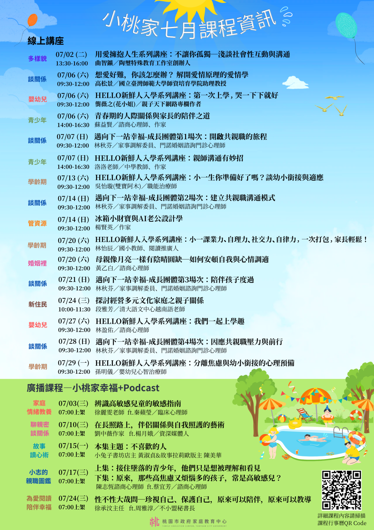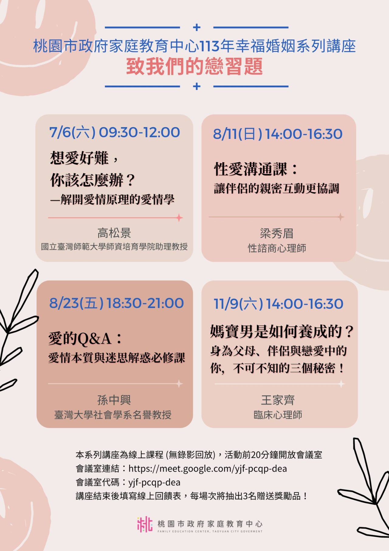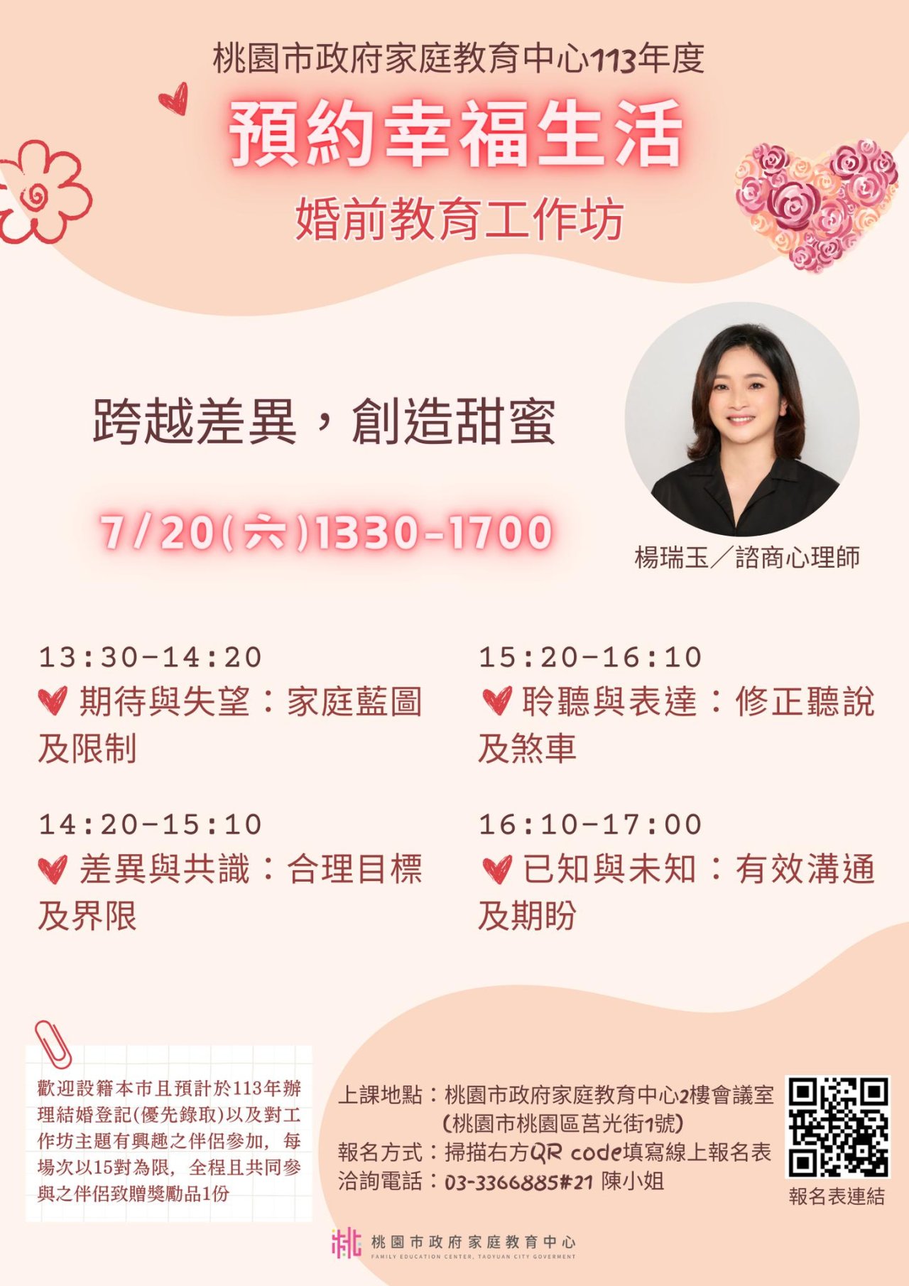 課程詳細資訊,請見中心課程行事曆( https://reurl.cc/xlGyGL )或追蹤「桃園市政府家庭教育中心」FB粉絲專頁;另倘有家庭教育個別化服務需求,可撥打4128185諮詢專線或申請小桃家線上諮詢室( https://reurl.cc/oZWOY5 )服務。