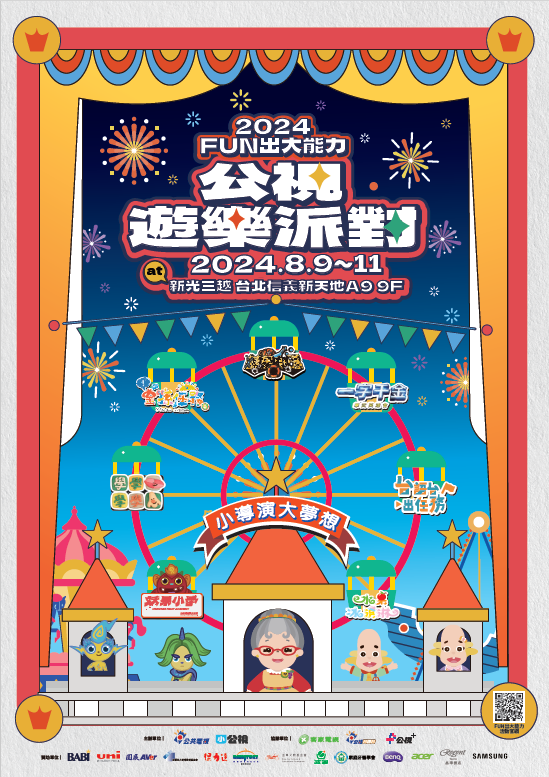 一、 公視第五屆年度兒童品牌活動【FUN出大能力】公視遊樂派對,集結公視、公視台語台、客家台旗下優質兒童節目,今年更有新開台的生力軍小公視新製節目加入一起共襄盛舉。【FUN出大能力】公視遊樂派對,8月9日(五)-8月11日(日)三天,在「新光三越 台北信義新天地A9 9F」(地址:台北市信義區松壽路9號9F)