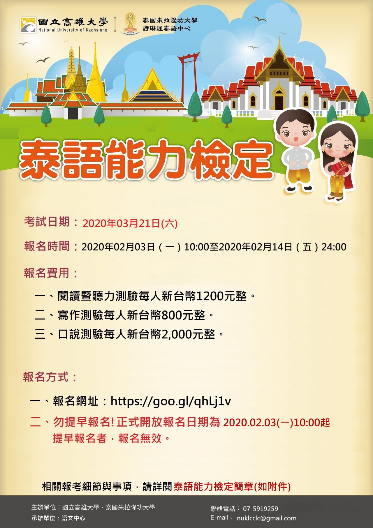 二、旨揭檢定係泰國朱拉隆功大學詩琳通泰語中心授權國立高雄大學辦理,該檢定為官方認定考試。
