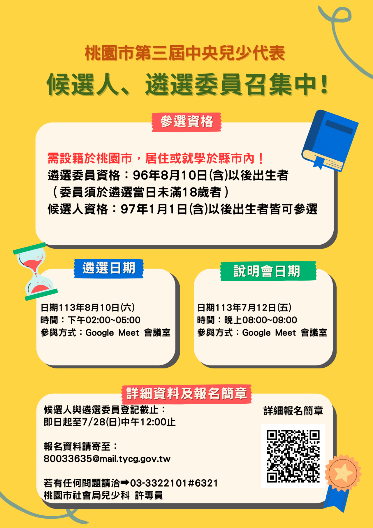 六、 為使兒少了解行政院及衛生福利部兒童及少年福利與權益事 務相關小組兒少代表制度,本局將於113年7月12日(星期五) 晚上8時至9時舉辦線上遴選說明會,歡迎符合遴選資格之兒 少踴躍參與,說明會表單統計至7月12日中午10:00,表單連結:https://forms.gle/pKMC1AxDpH8UKVbE6。