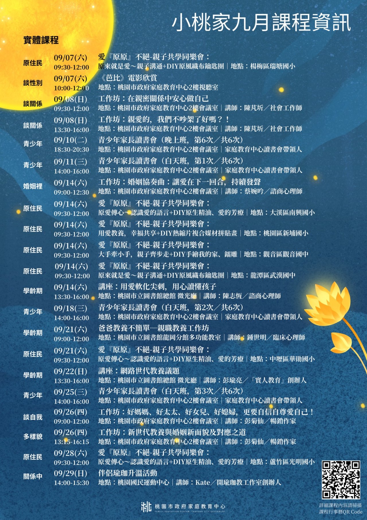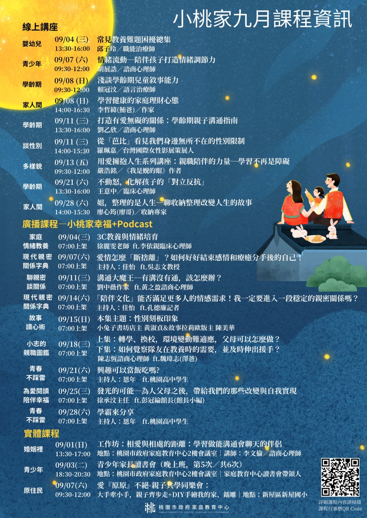 課程詳細資訊,請見中心課程行事曆( https://reurl.cc/xlGyGL )或追蹤「桃園市政府家庭教育中心」FB粉絲專頁;另倘有家庭教育個別化服務需求,可撥打4128185諮詢專線或申請小桃家線上諮詢室( https://reurl.cc/oZWOY5 )服務。