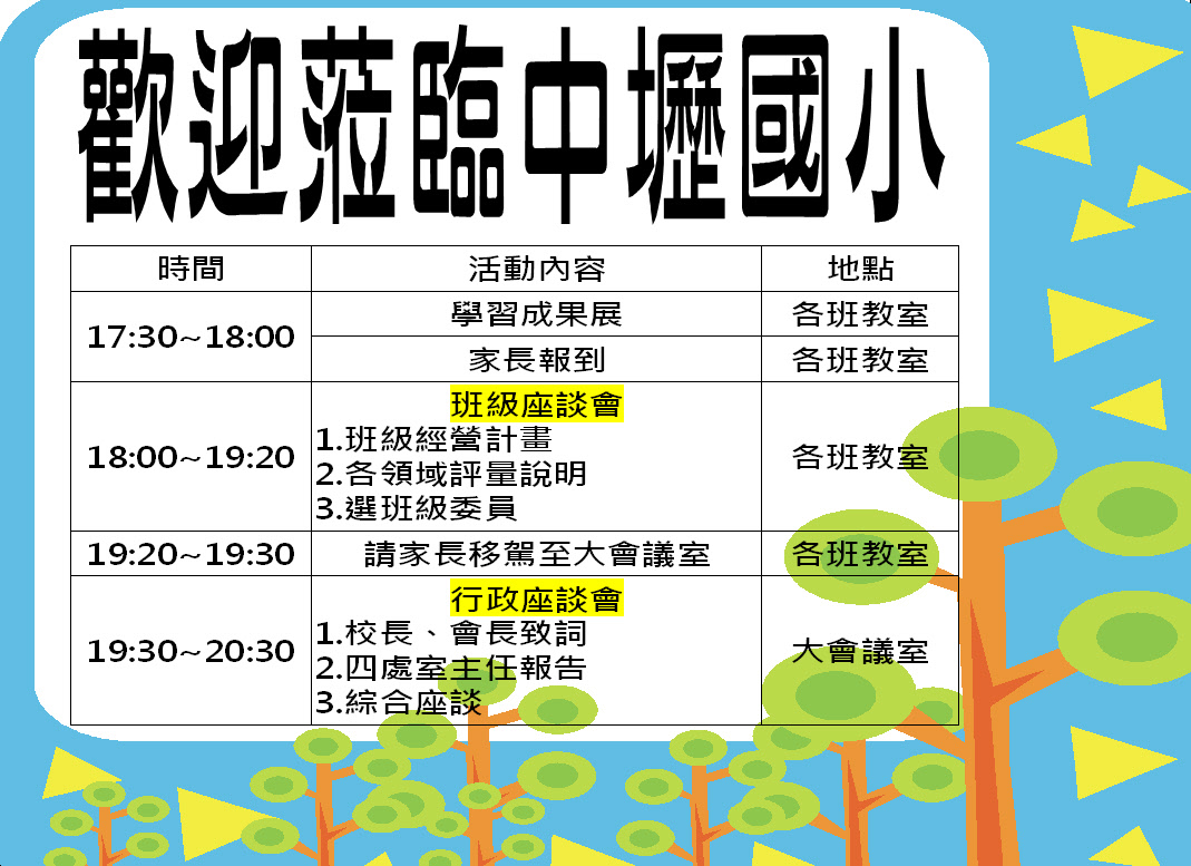 班親會這是一個親、師溝通的重要歷程,誠摯的期待各位家長能撥冗來參與班親會及家長座談會,您的參與對孩子、教師與學校行政來說是一股重要的支持力量,歡迎大家到中壢國小共度一個充實美好的夜晚!