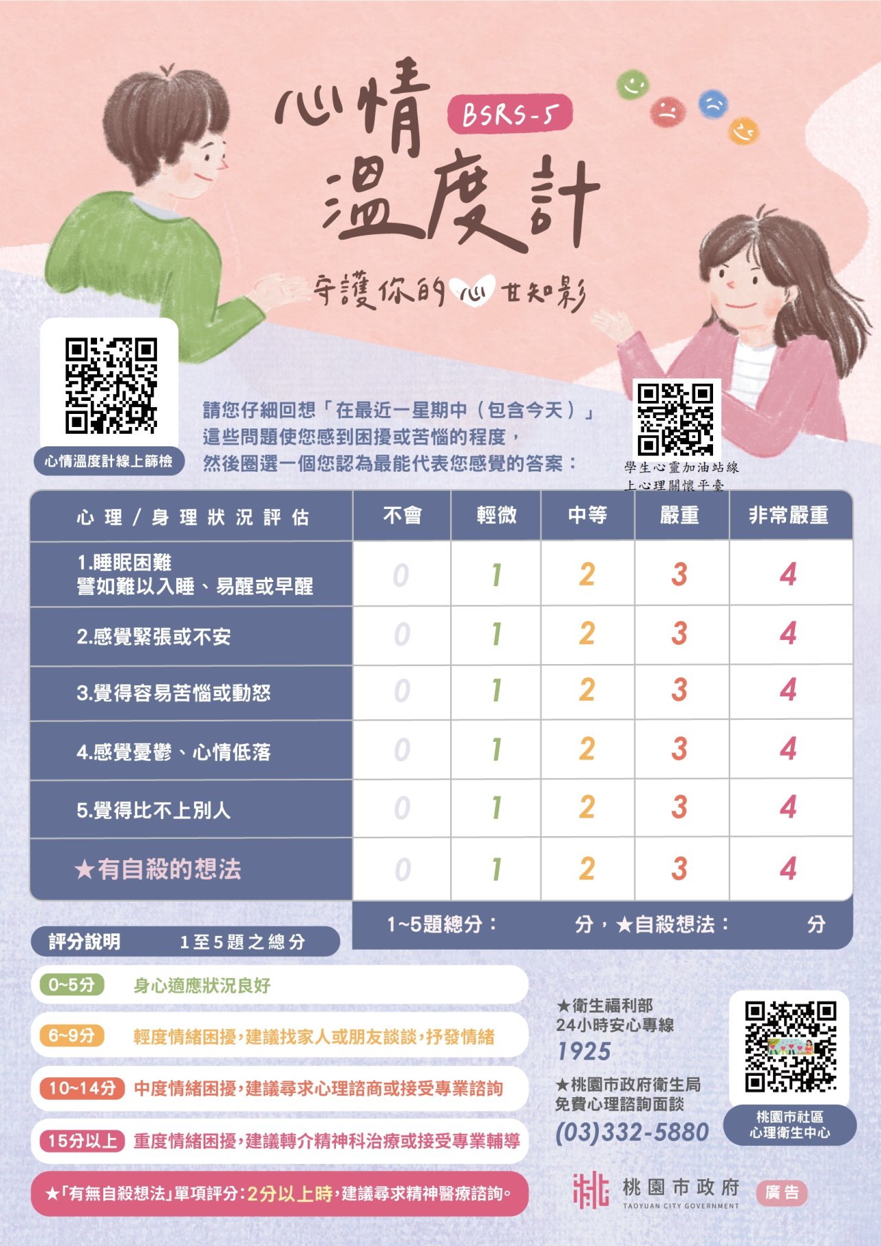 民眾瞭解自己近期的身心狀況,適時運用心理衛生資源及求助專業協助達轉介標準者(總分15 分以上或有自殺想法分數2分以上),後續將由本府衛生局致電關懷,評估是否持續追蹤或轉介相關單位。