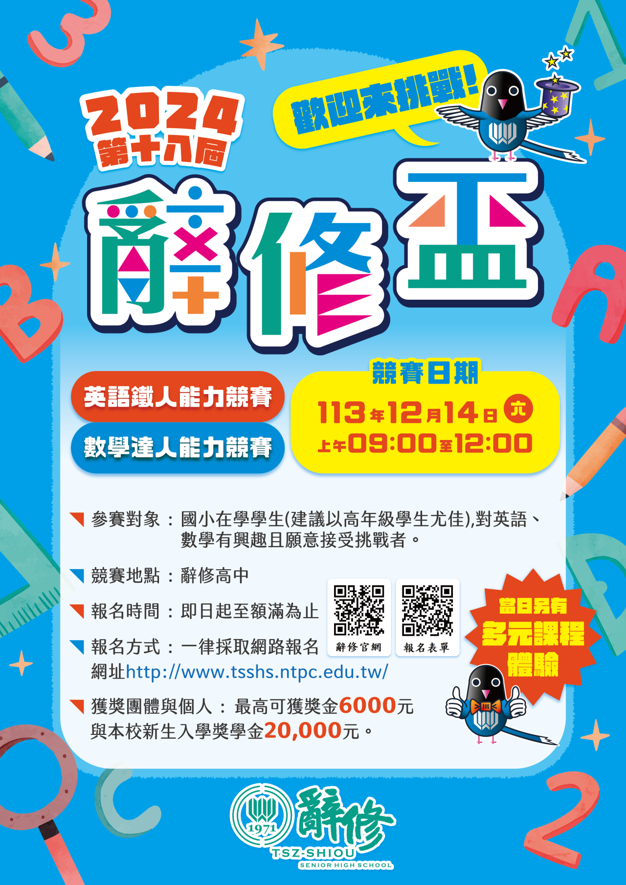 | 四、 | 競賽辦法詳如附件(可於本校官網/辭修盃報名專區下載);如有任何關於比賽的問題,請洽本校設備組查詢,聯絡電話:02-86761277#210。 |