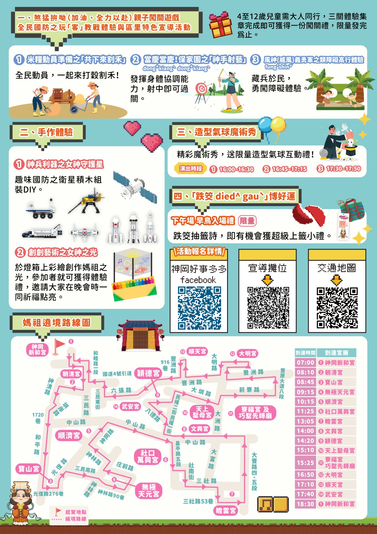 (二) 活動結合全民國防、神岡客底文化及媽祖信仰等3大元素,打造下午場主題活動-煞猛拚呦(加油、全力以赴)!全民國防之玩「客」教戰體驗暨區里特色宣導活動,包含親子闖關、手作及共創藝術體驗、秘密小活動「跌筊died^ gauˋ」博好運等單元。