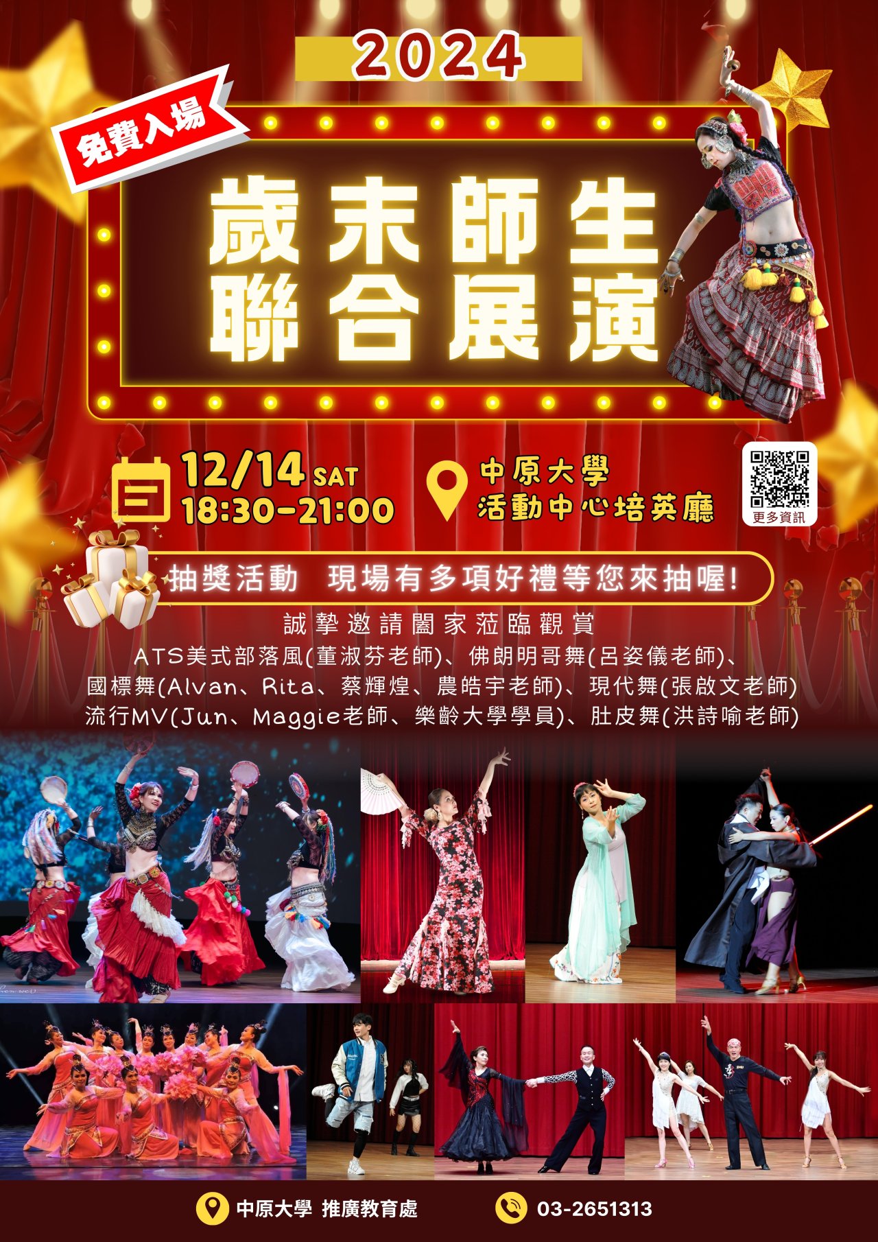 三、 展演資訊請至本校推廣教育處網站查閱(https://pse.is/6pkzn5 ),洽詢電話:03-2651313 服務專員。