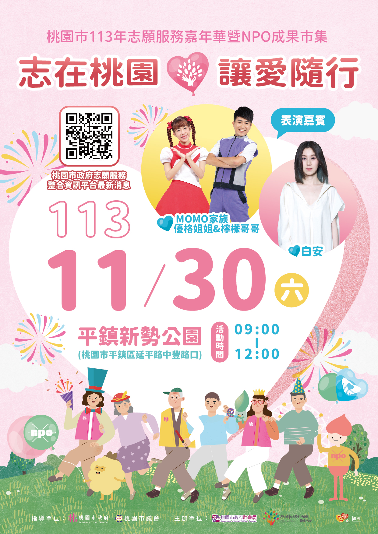 活動資訊如下: (一) 活動時間:113年(以下同)11月30日(六)9時至12時。 (二) 活動地點:桃園市新勢公園(桃園市平鎮區中原路與延平路一段交叉口)。 (三) 參與對象:本市志願服務各目的事業主管機關、志願服務運用單位、志工、NPO及社會大眾。