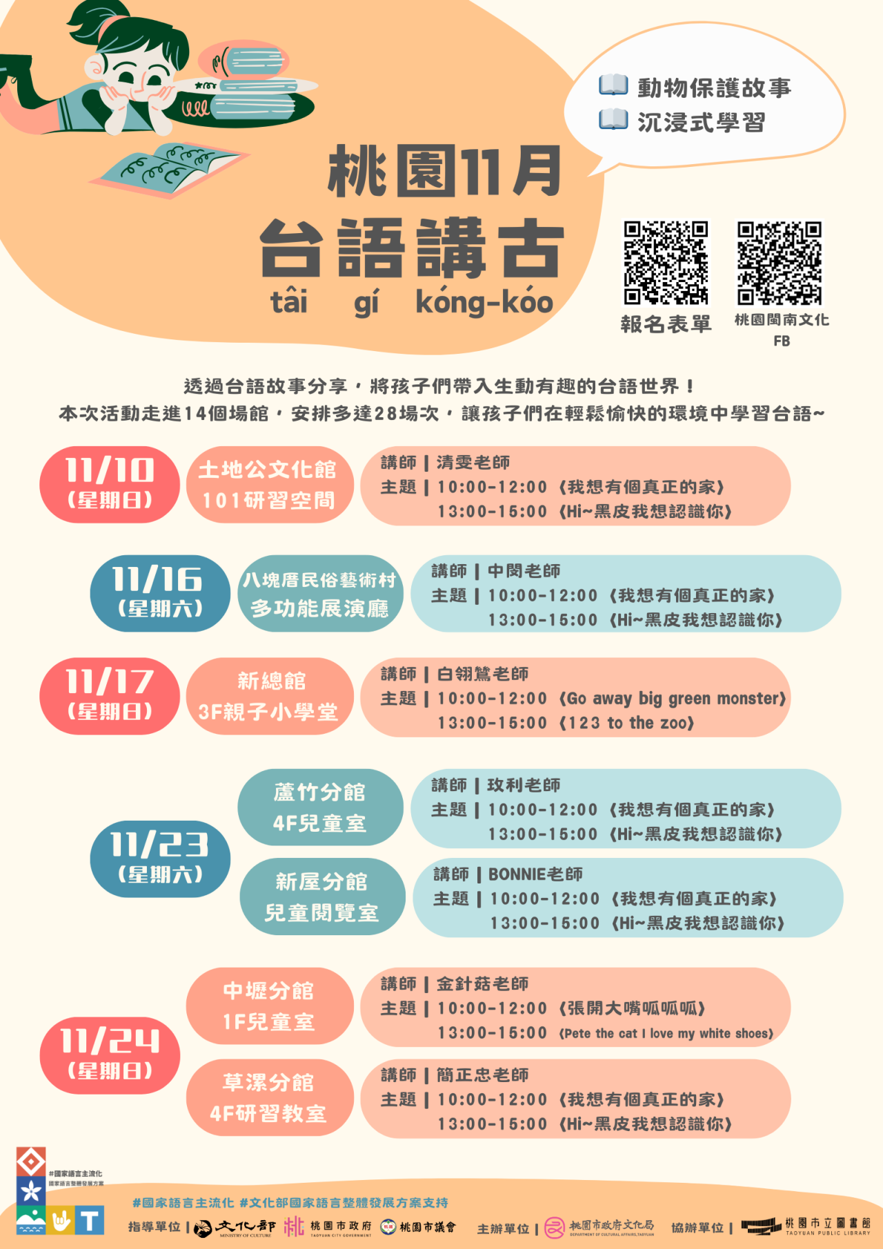 為配合文化部核定本府「文化部補助直轄市及縣市政府推動國家語言發展計畫要點」補助案,本府文化局規劃與本市圖書館合辦「台語說故事」系列活動,創造台語環境,鼓勵學童學習母語。
