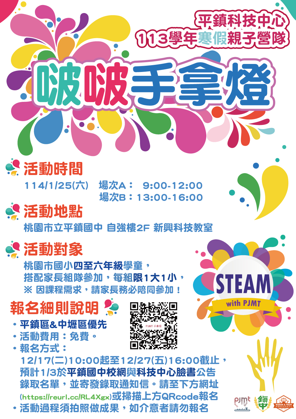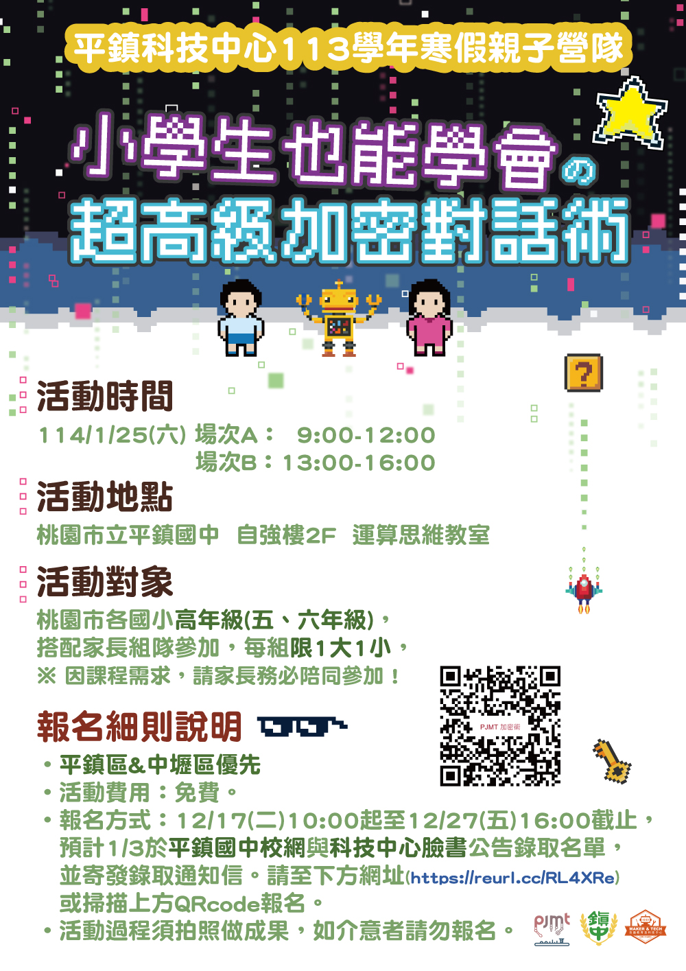 七、 報名方式:請家長自行於12/17(10:00)-12/27(16:00)上網報名,報名網址如前開資訊,或掃描各主題活動海報之QRcode。