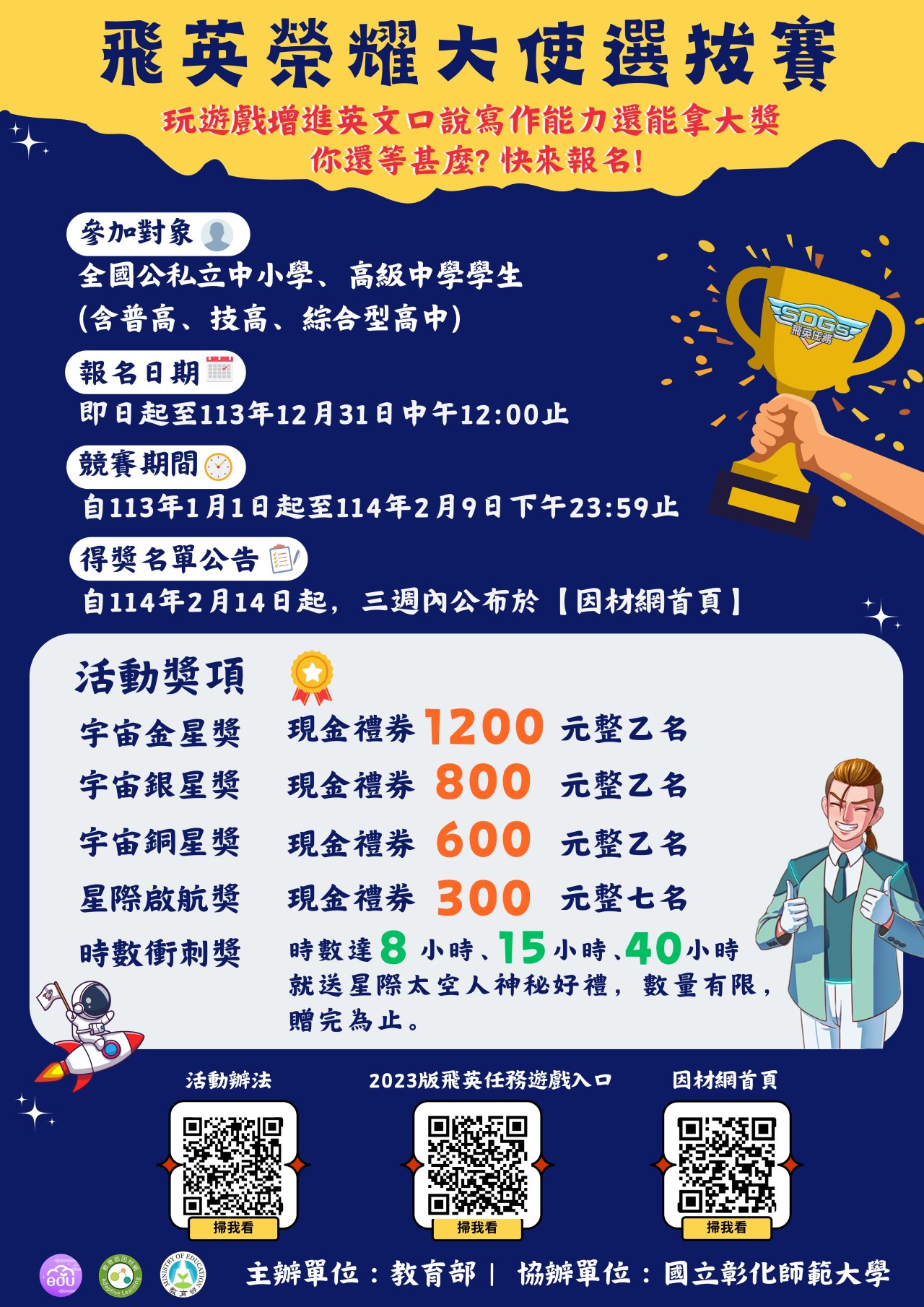 | 二、 | 為提升全國中小學及高級中學學生的英語口說與寫作能力,教育部「高中英語文口說及寫作遊戲開發與推廣計畫」推出「SDGs 飛英大使年度排行榜積分賽」,邀請學生成為「飛英大使」。此遊戲式教材結合SDGs主題影片與互動任務,幫助學生提升聽力、口說及寫作能力,並鼓勵學生持續運用該平台素材強化英語學習動機。 |
