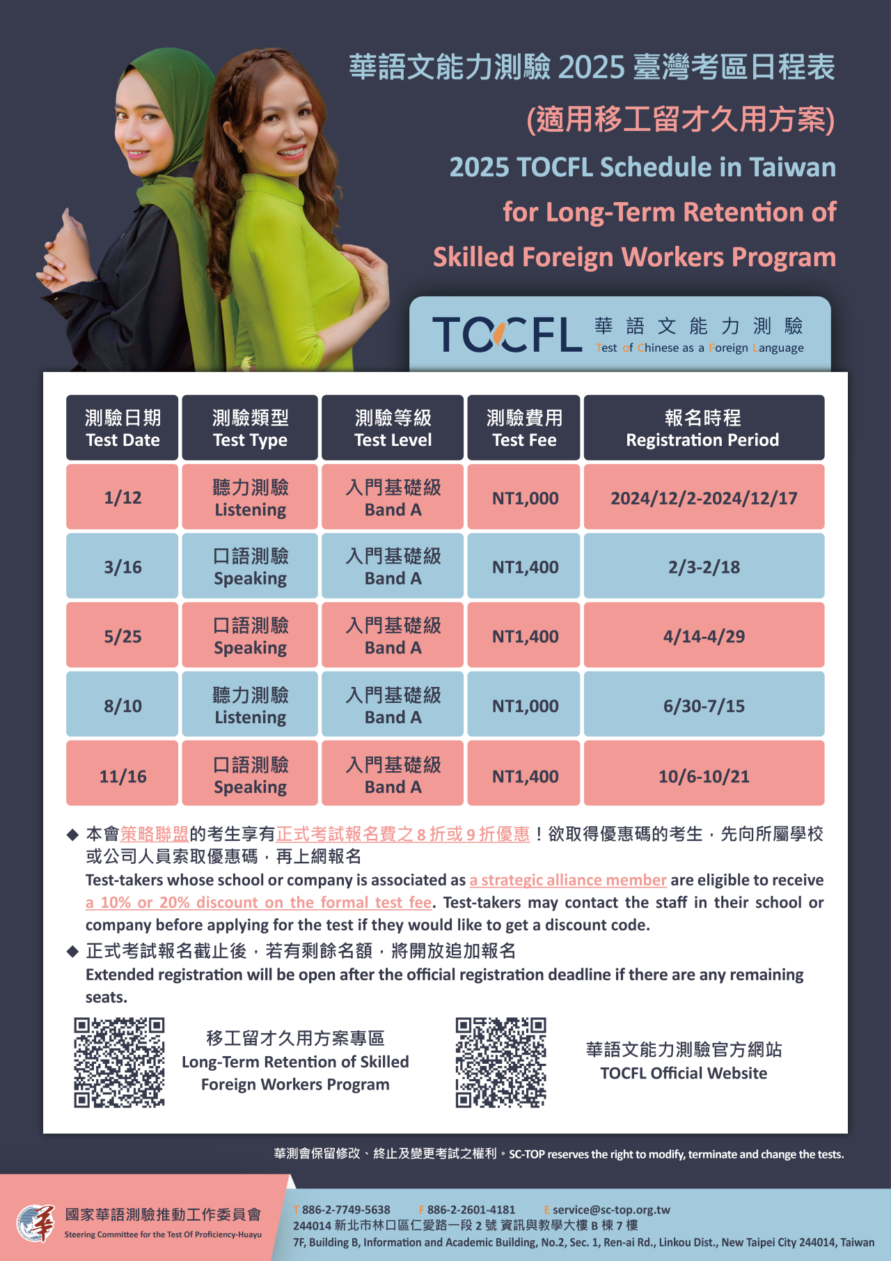 | 四、 | 為配合勞動部移工留才久用方案,114年共舉辦2次聽力測驗正式考試及3次口語測驗正式考試,皆於週日辦理,相關日程安排及報名費用請見附件。 |