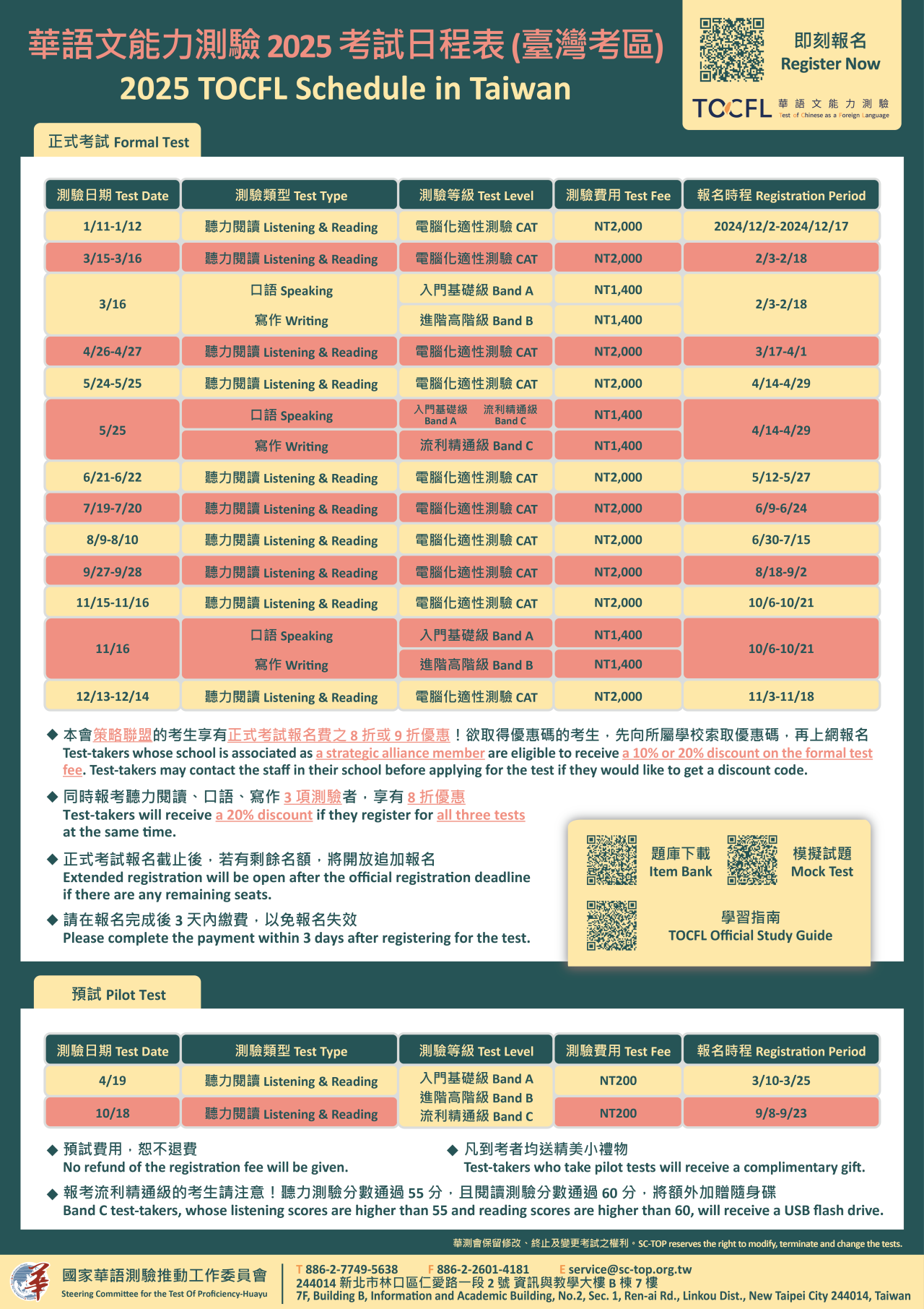| (一) | 114年正式考試日程表:https://tocfl.edu.tw/tocfl/index.php/sign_up/tw/list/1。 |