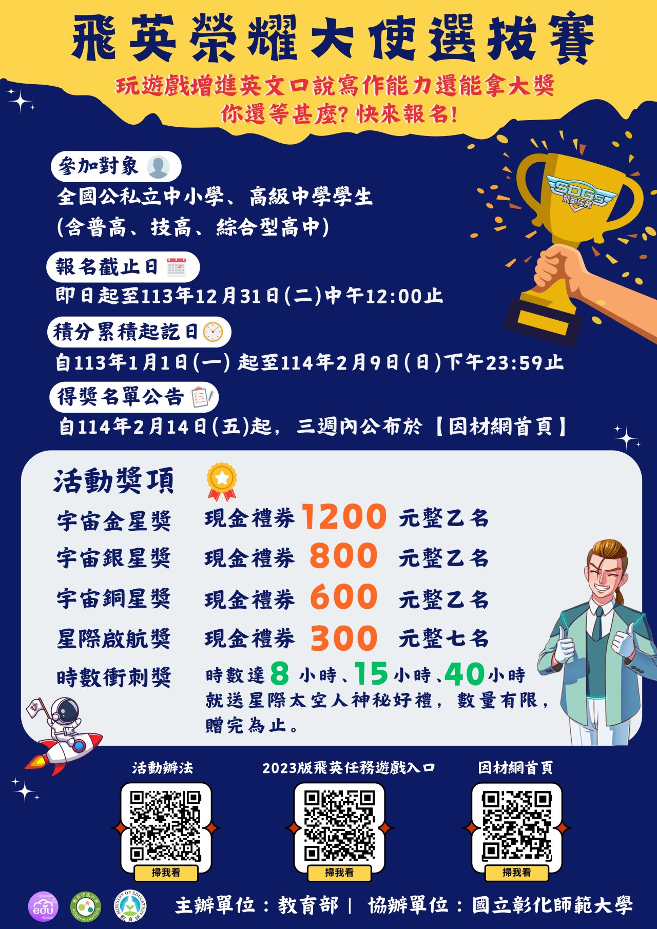 | 二、 | 為提升全國中小學及高級中學學生的英語口說與寫作能力,教育部『高中英語文口說及寫作遊戲開發與推廣計畫』推出「SDGs 飛英大使年度排行榜積分賽」,邀請學生成為「飛英大使」。此遊戲式教材結合SDGs主題影片與互動任務,幫助學生提升聽力、口說及寫作能力,並鼓勵學生持續運用該平台素材強化英語學習動機。 |