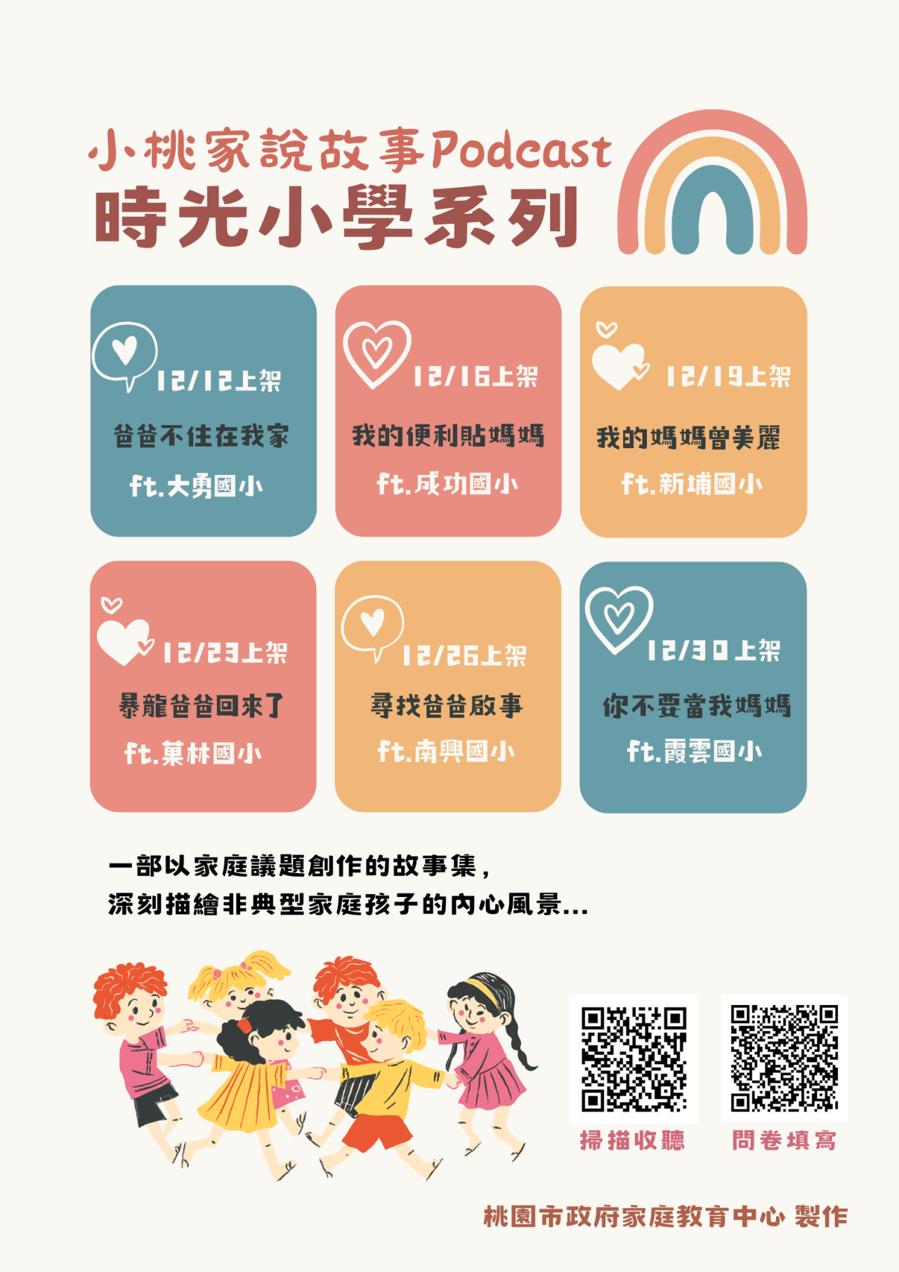 時光小學系列廣播劇於12月12日至12月30日,每星期一、星期四晚間7點上架於「小桃家幸福+」Podcast平台( https://reurl.cc/qr0v03 ),共計6集故事,每個故事都有一個提問,家長可帶領孩子討論並填寫問卷( https://reurl.cc/O5Vb77 ),每集將抽出5本時光小學當集書本送給聽眾,得獎名單於114年1月6日(星期一)公告於家庭教育中心臉書專頁 ( https://www.facebook.com/tycfamily/ )。