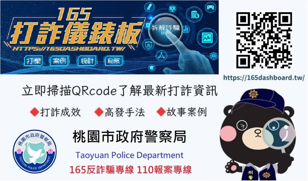 | 二、 | 為強化防詐意識,提升政府打擊詐欺犯罪透明度,並落實「新世代打擊詐欺策略行動綱領2.0」宣導教育面向,內政部警政署業推出「165打詐儀錶板」專網如下。 |