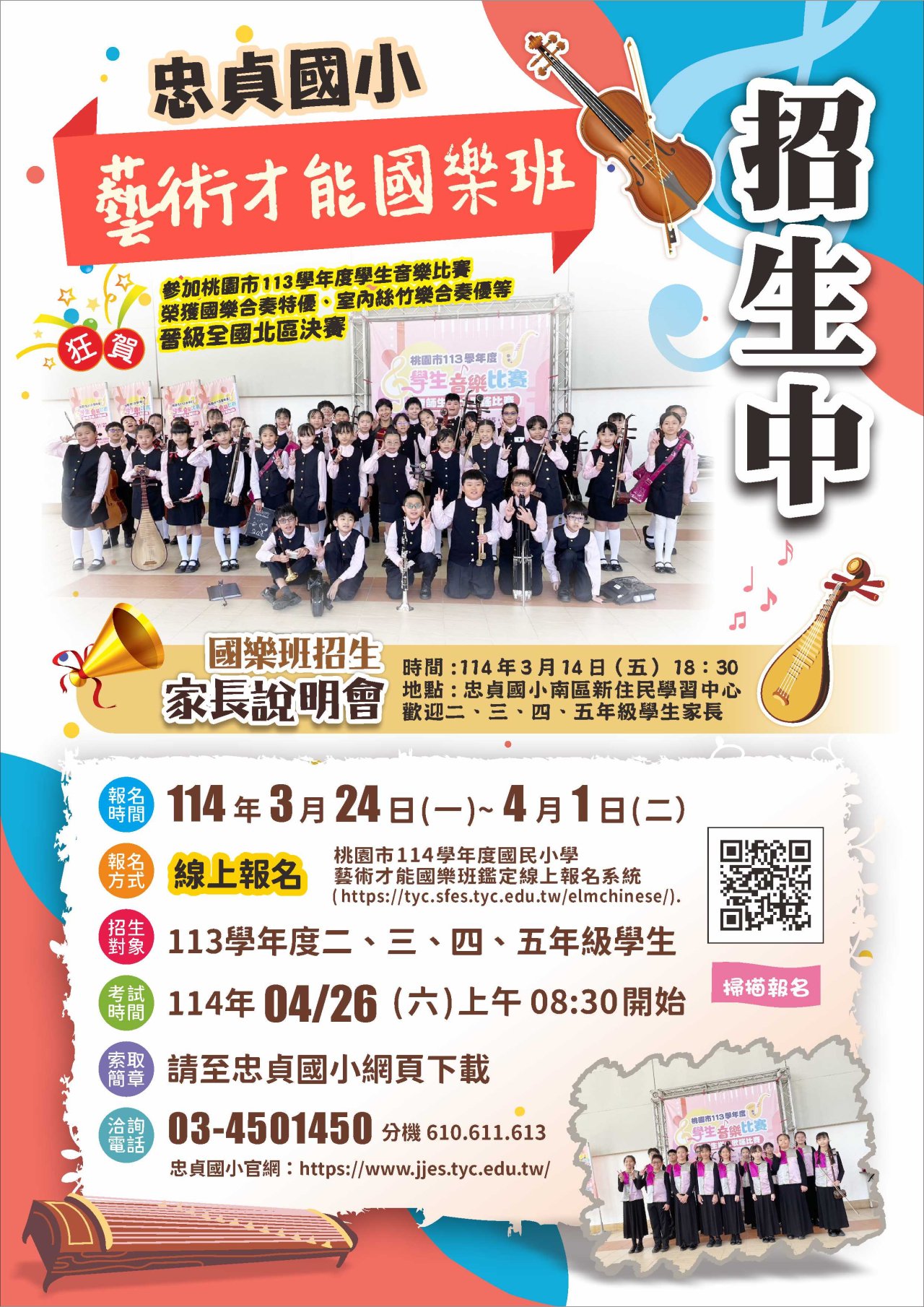 轉知:桃園市114學年度國民小學藝術才能國樂班鑑定招生家長說明會