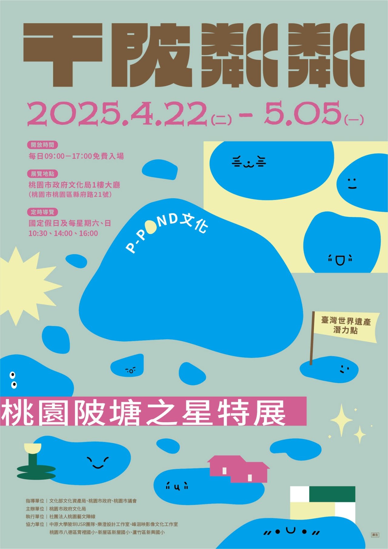 一、 本次展覽以「千陂粼粼-桃園陂塘之星」為題,象徵陂塘背後代表一個個亮眼且不可取代的故事。展覽將陂塘比喻為一個個明星,以明星引起的潮流、文化來討論陂塘的歷史脈絡、日常生活、產業發展及生態環境;呈現桃園各地區的陂塘故事,用追星的視角來了解陂塘各方面,如何產生不同的生活樣貌以及不能或缺的關鍵。